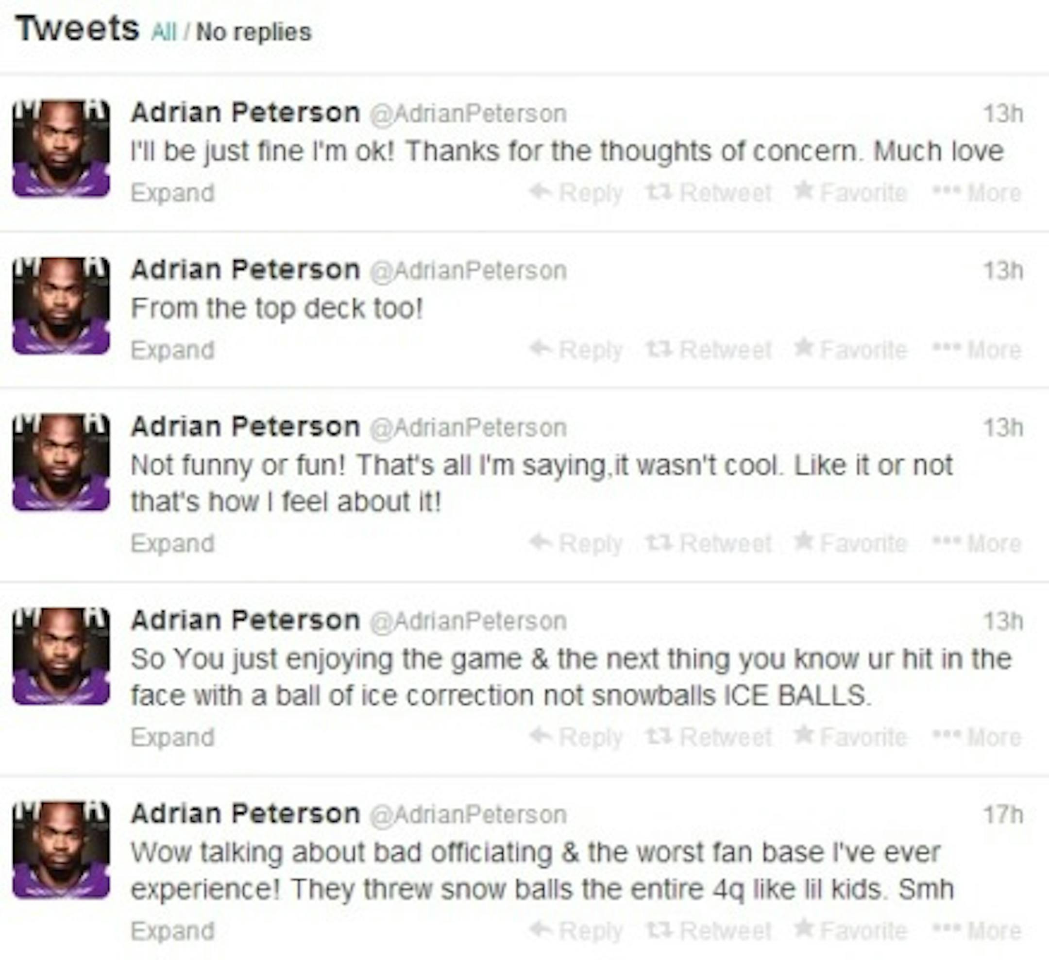 "Some of the calls that were made. To me, it was kind of one of those games where it was like, 'Wow, I can't believe that was called,'" Peterson said. "Then, to top it off, they got the worst fans in the NFL throwing snowballs the entire fourth quarter like kids. It was a bad feeling, a bad experience."