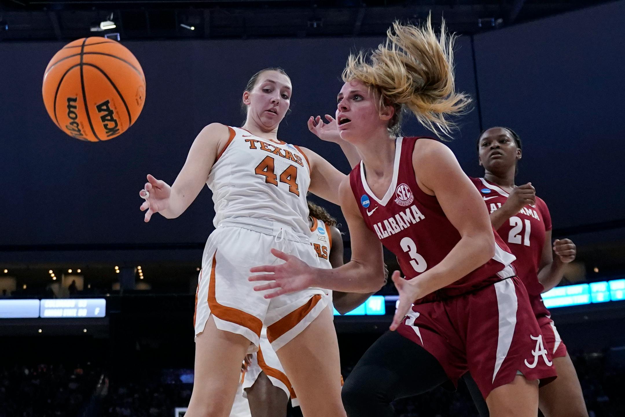 Undeterred, Moore matched her career best with 21 points, had 10 rebounds and made a timely defensive play in the fourth quarter to help No. 1 seed Texas beat Alabama 65-54 on in a second round women’s NCAA Tournament game.