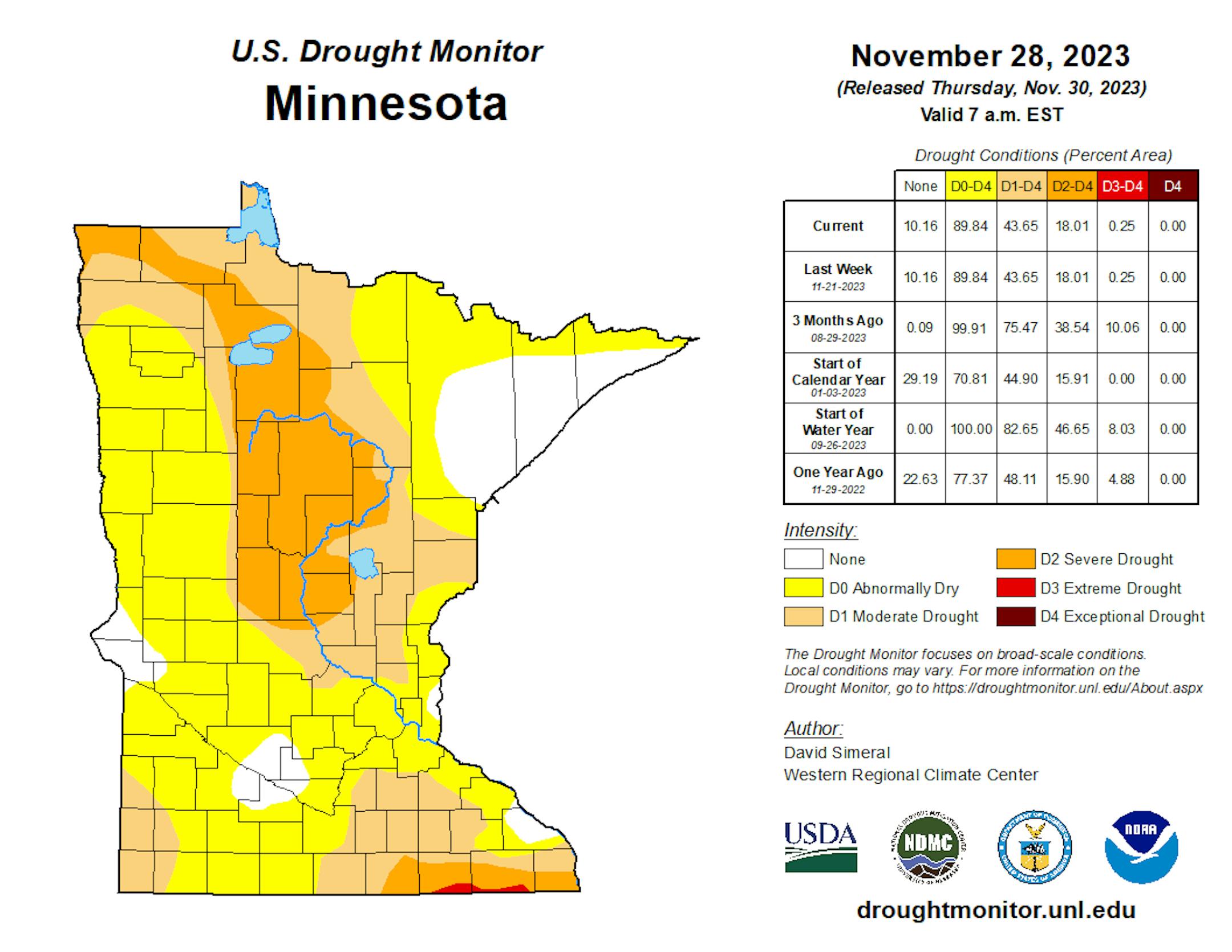 We're reaching the time of the year when it'll become tough to see major changes to the drought monitor across the region... and in this week's update, there is no change to the numbers. Approximately 89.4% of Minnesota remains under at least abnormally dry conditions, with 0.25% under Extreme Drought.