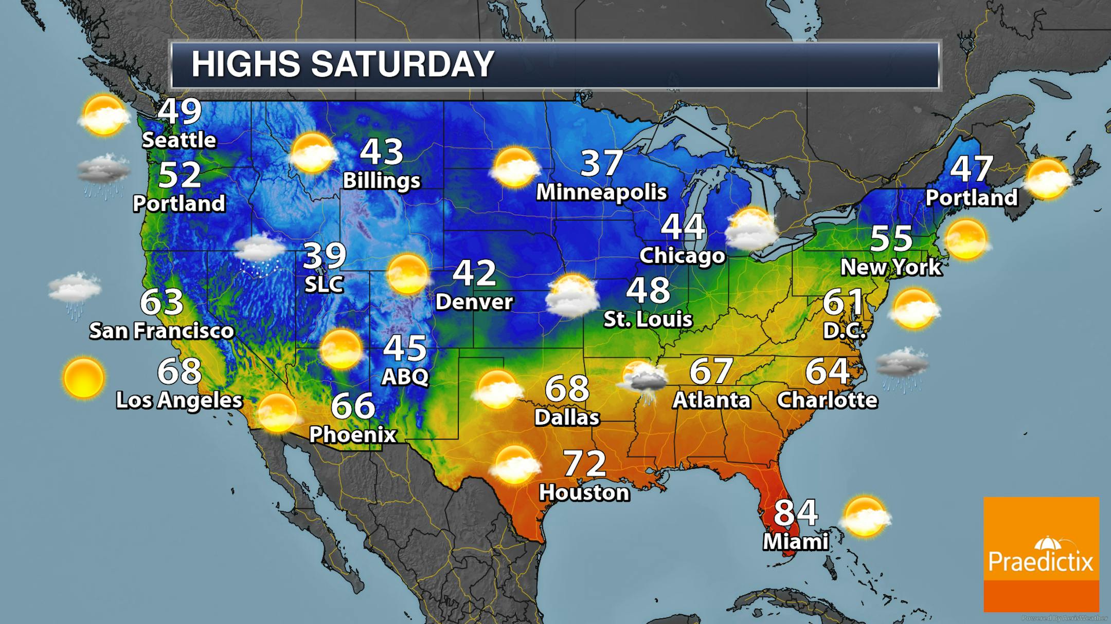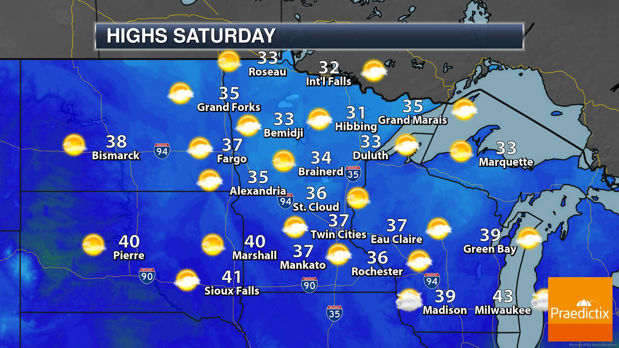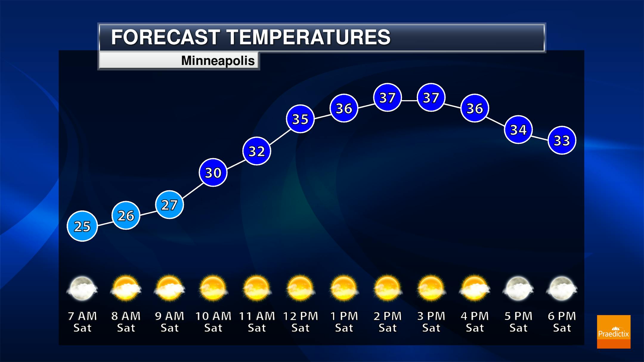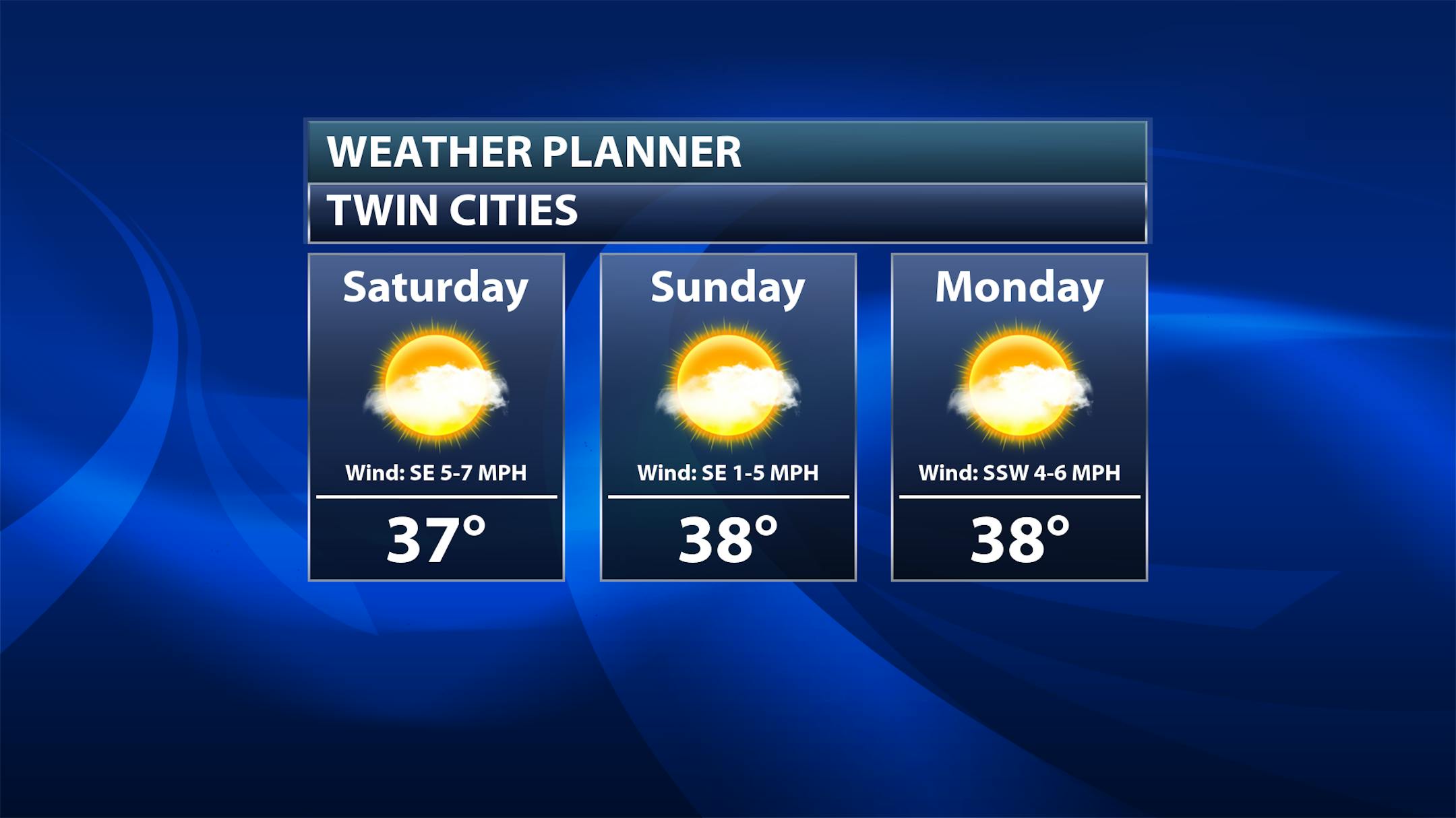 A sun/cloud mix to mainly cloudy Saturday is expected here in the metro - but, besides that, we aren't tracking any major concerns. Morning temperatures will start in the mid-20s with highs in the mid/upper 30s.