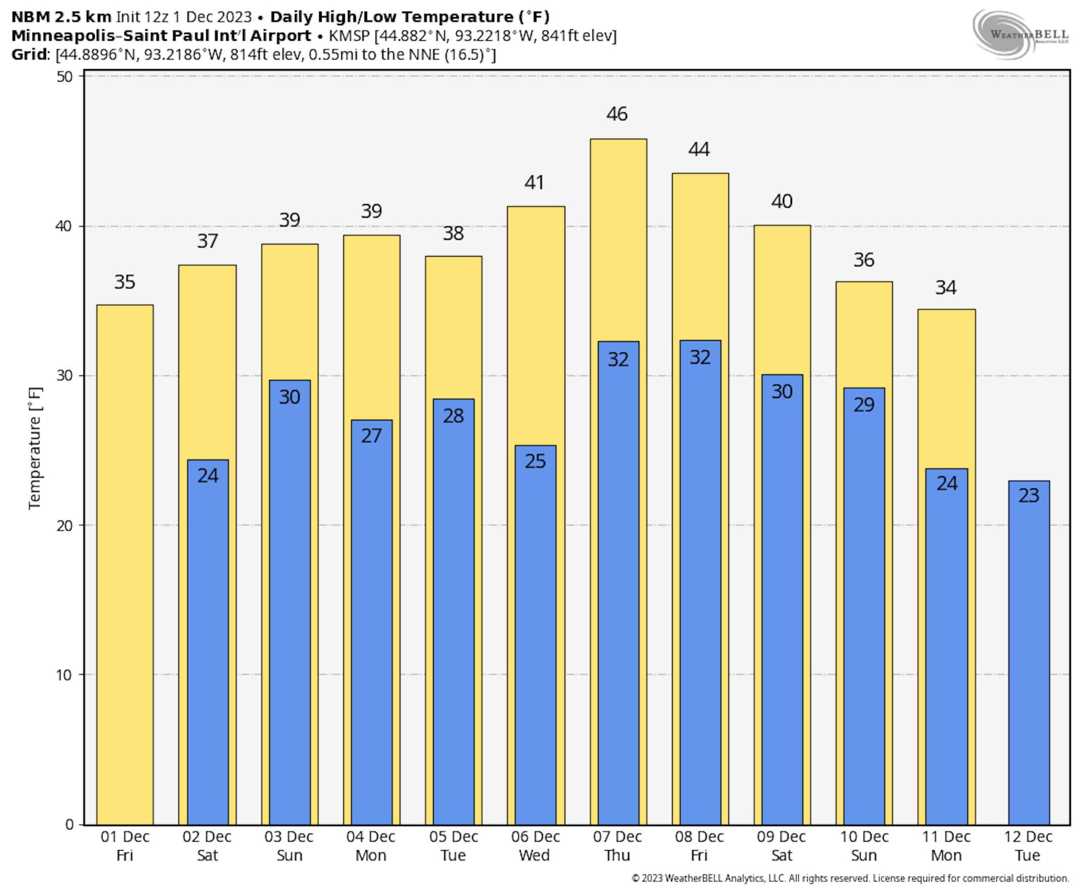 A mix of sun and clouds to mainly cloudy skies is expected across much of the state on Saturday. Temperatures will mainly be above average, touching the 40s in southwest Minnesota but stuck in the 30s elsewhere. A system mainly passing to our east could bring some snow to southeastern Minnesota (maybe reaching the metro?) Saturday Night. In far southeast Minnesota, totals from this snowfall might approach an inch or an inch and a half.