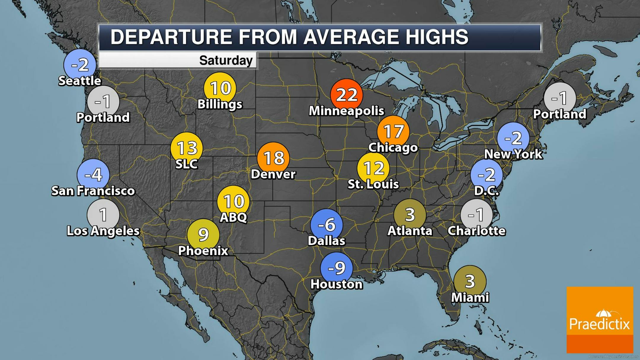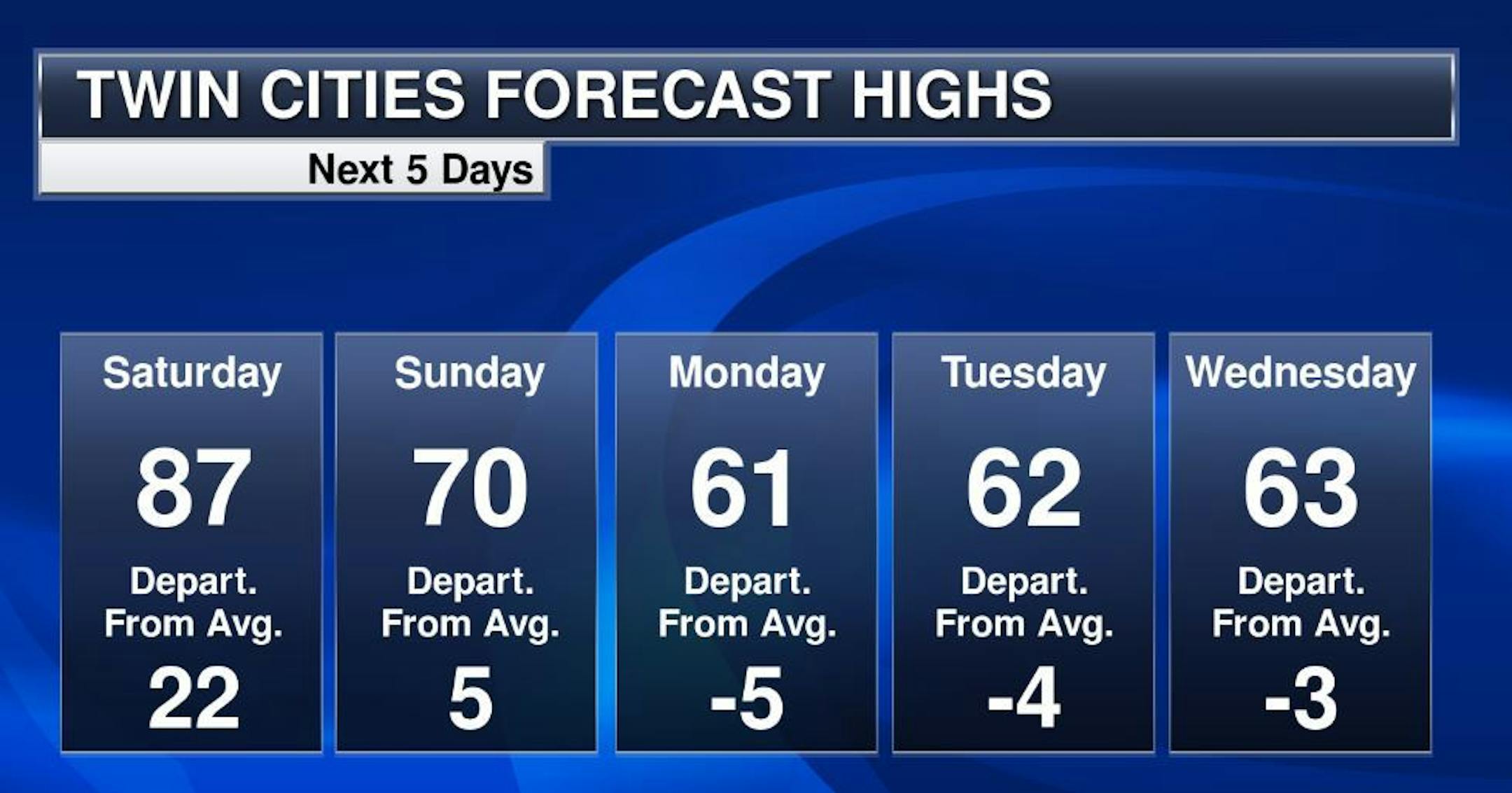 Here's the extended temperature and weather outlook over the next 5 to 7 days in the Twin Cities. Highs this weekend will be warmer than average and especially on Saturday, where readings will only be a few degrees away from records. Next week, temps will be back down below average with highs only warming into the lower 60s.