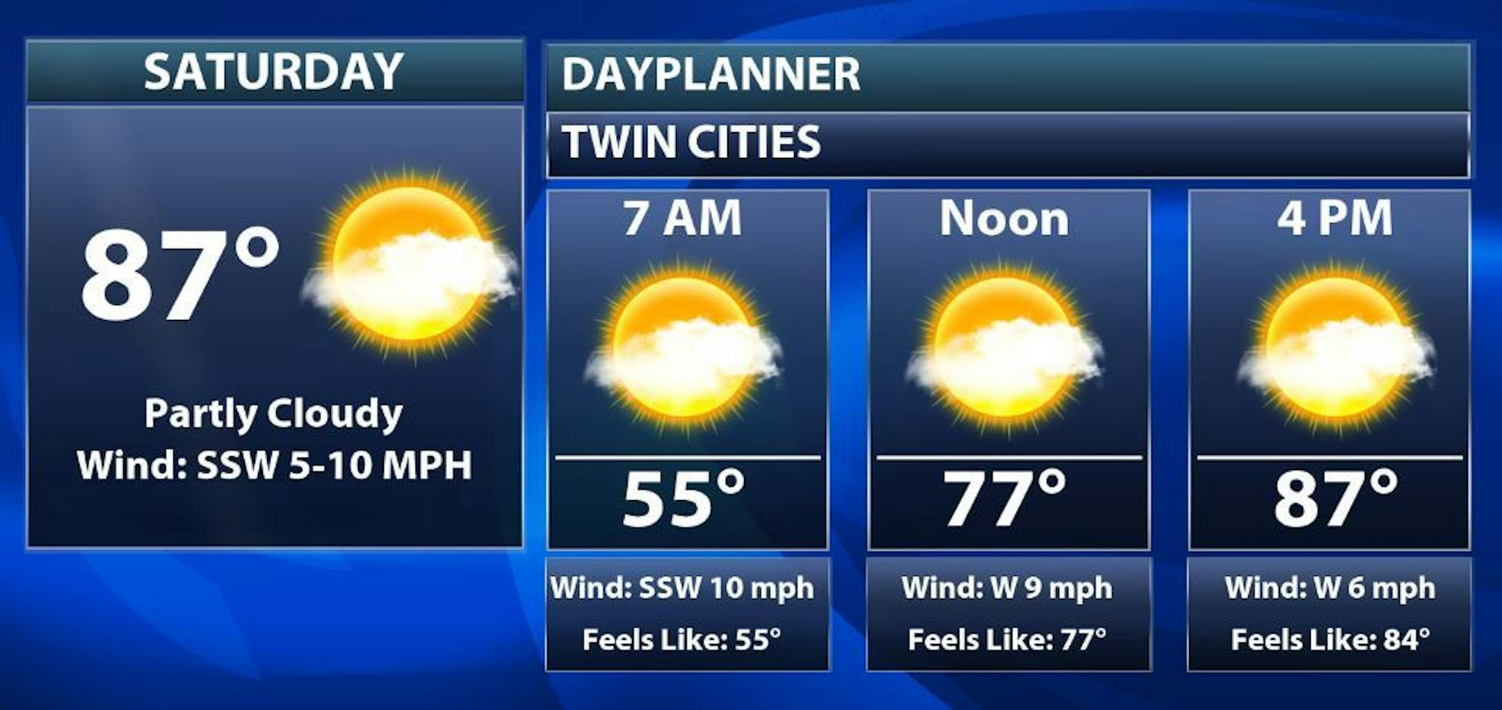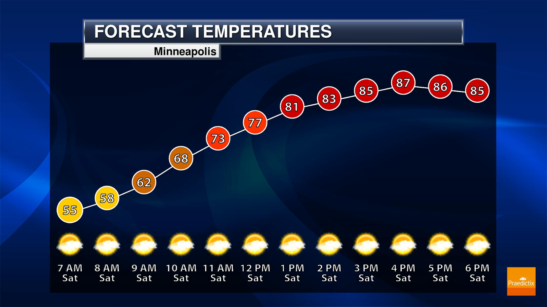 Here's a closer look at our Saturday weather for Minneapolis, which shows temps warming into the 80s by the afternoon, which will be very warm for the first day of May. We'll have a mix of sun and clouds with a decent breeze.