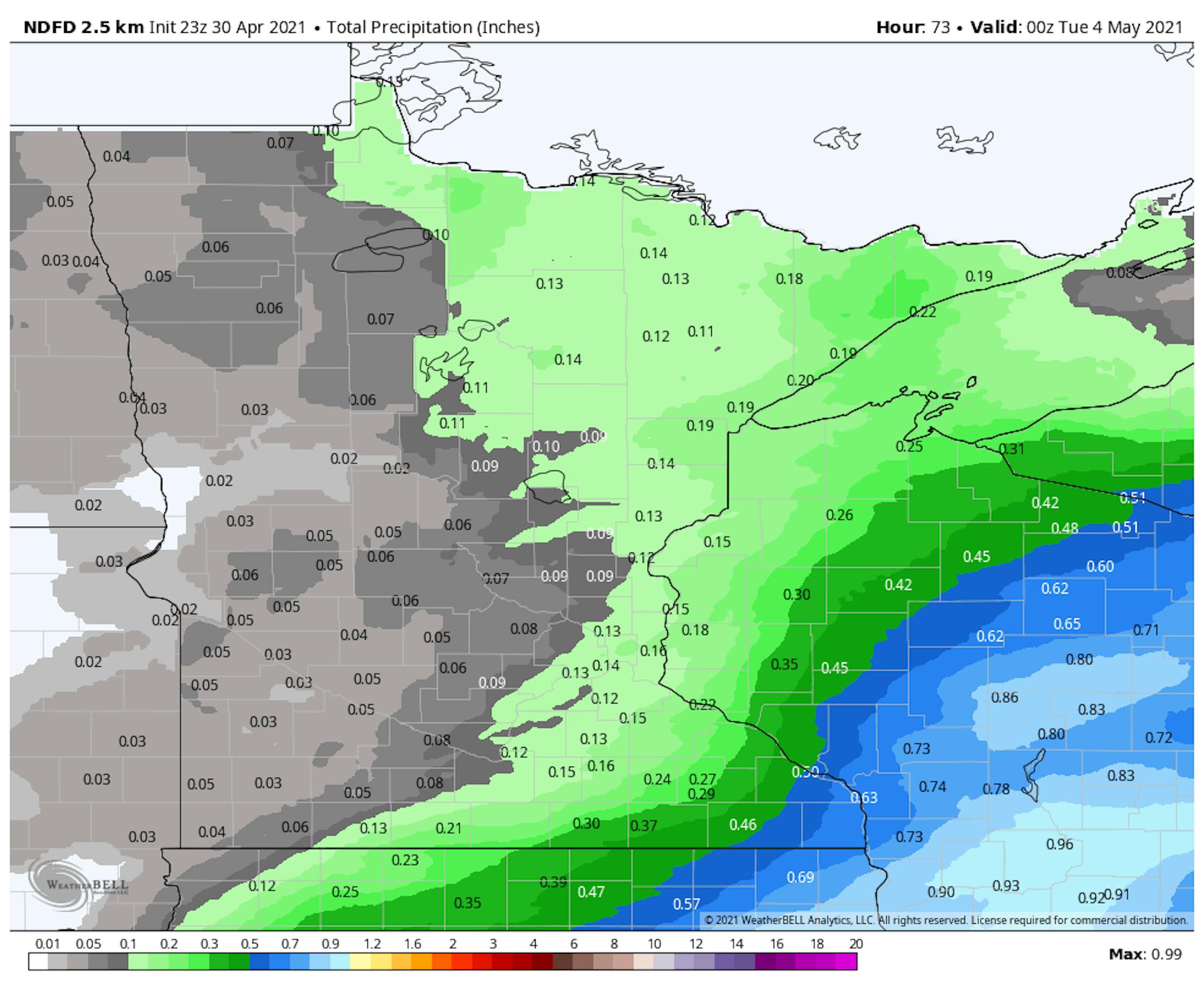 Here's the precipitation potential through Monday, which shows some of the heaviest south and east of the Twin Cities metro. Some spots in Iowa and Wisconsin could see close to 1" of rain through early next week.