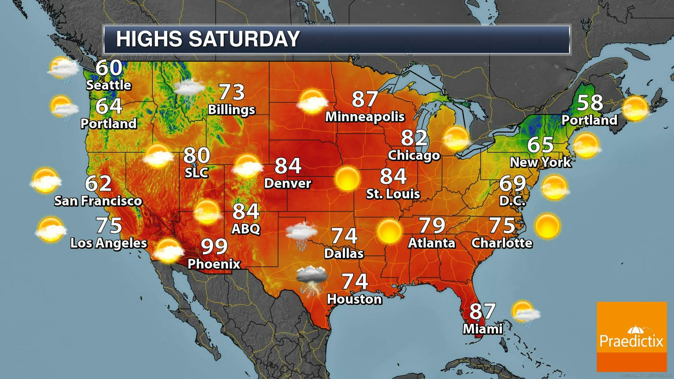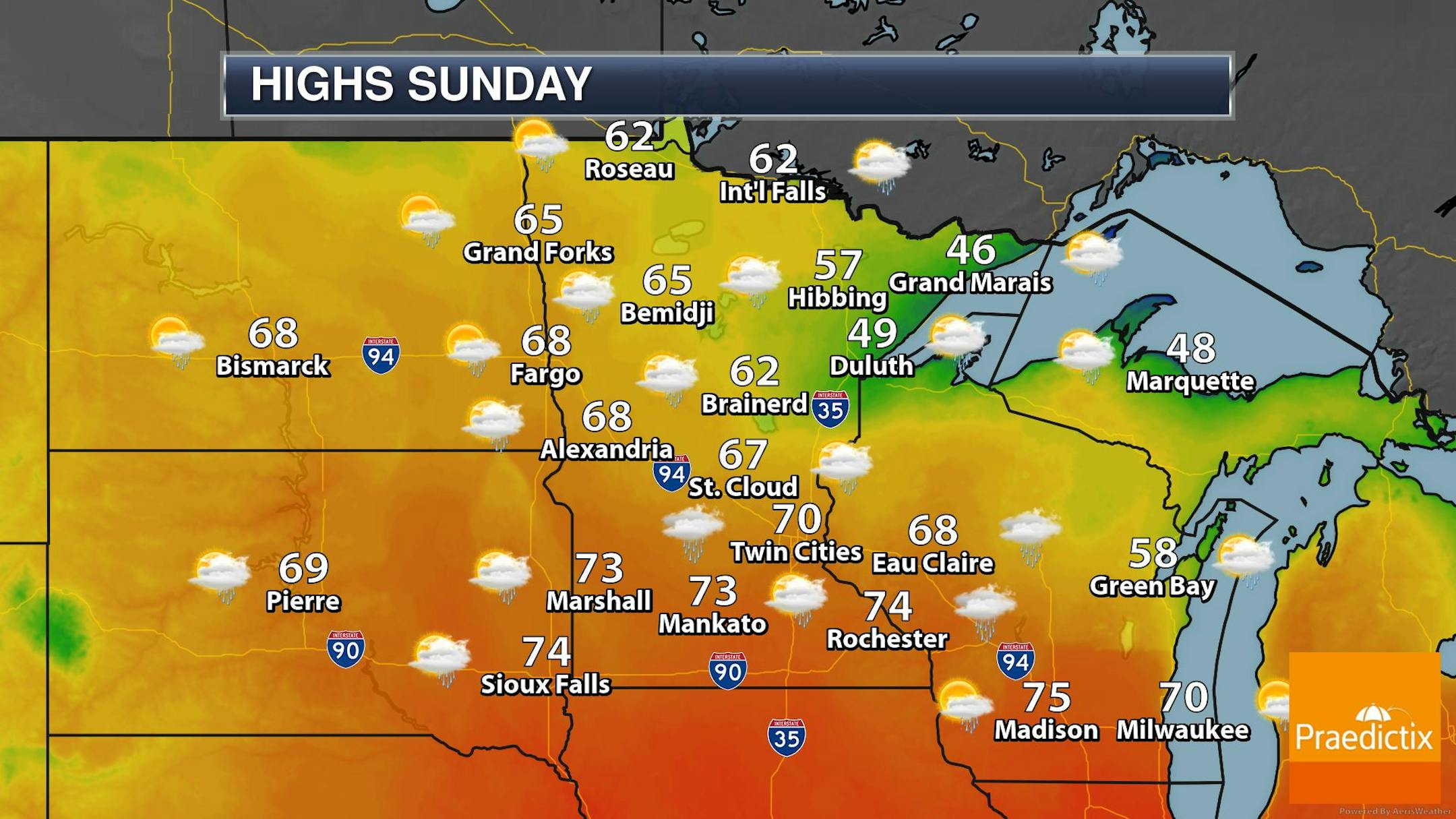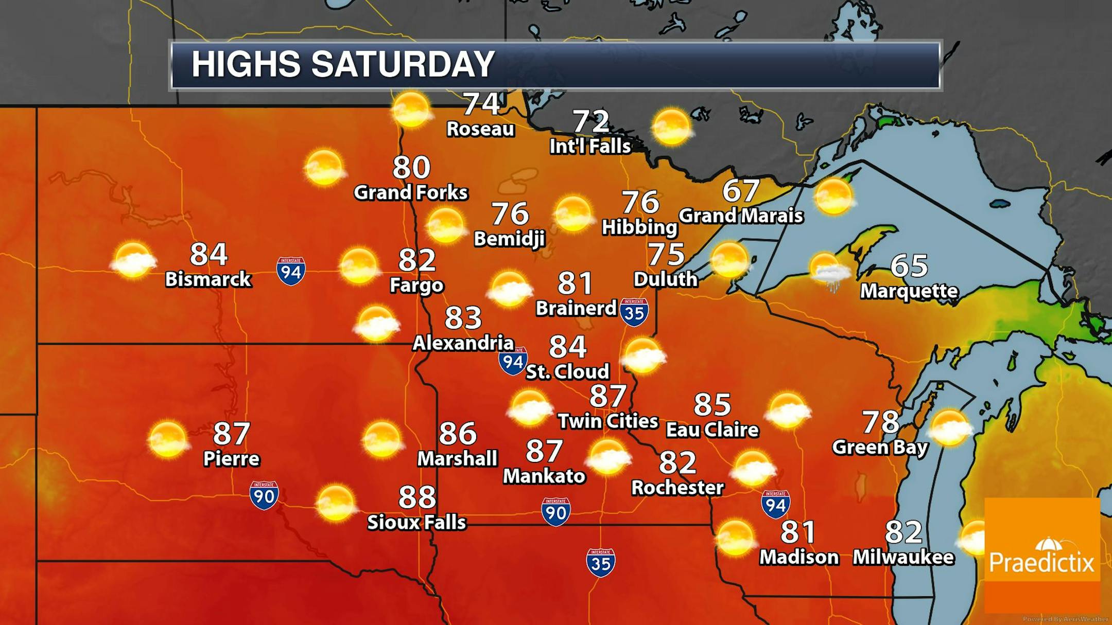 Saturday will be a very warm day across the region with weather conditions turning a little unsettled Saturday night into Sunday. Scattered showers and storms will be possible late weekend with a few pockets of heavy rain, mainly south and east of the Twin Cities.