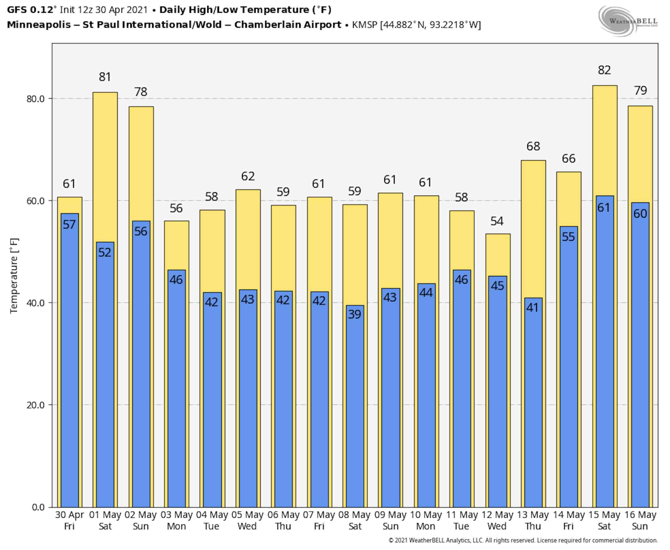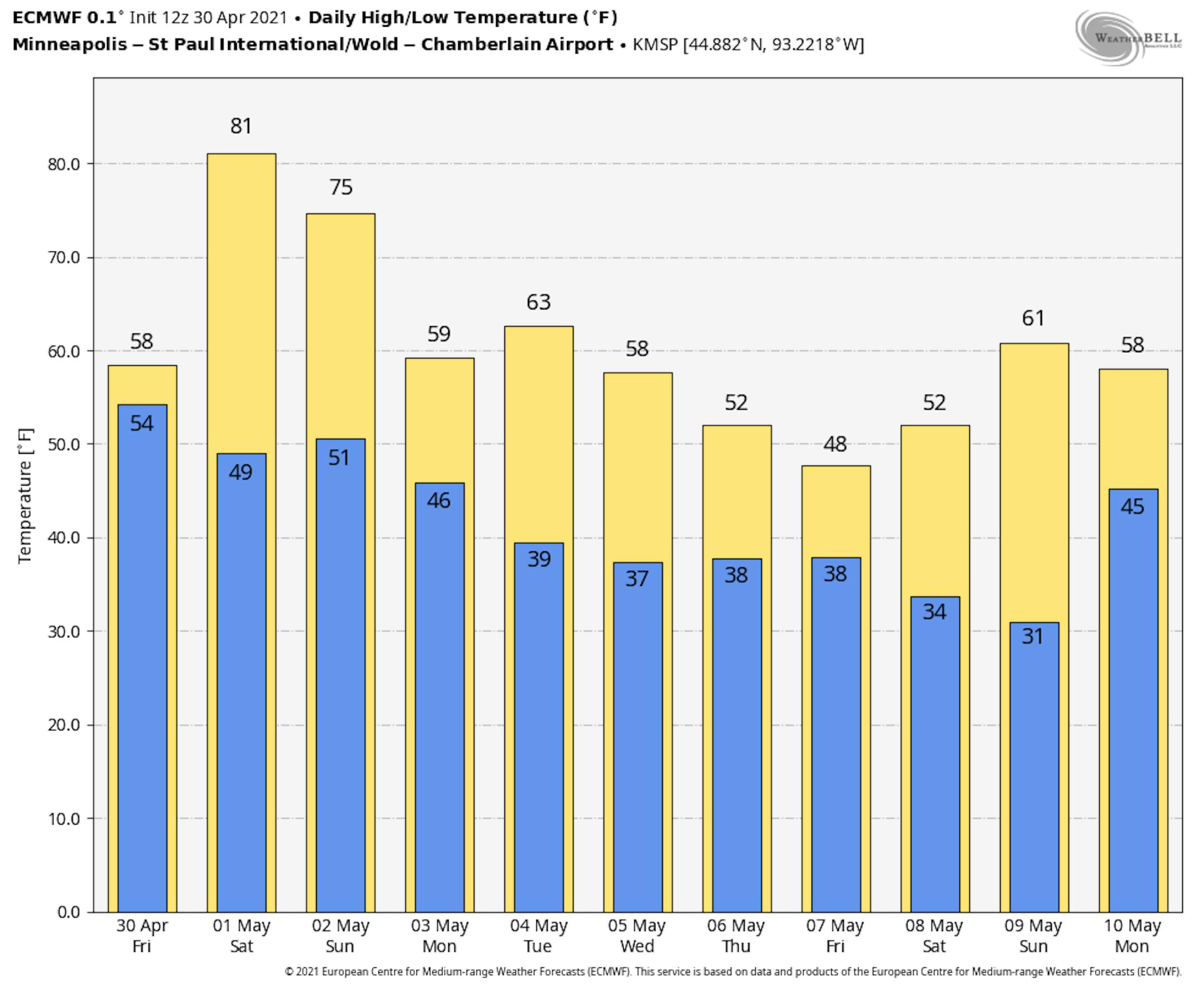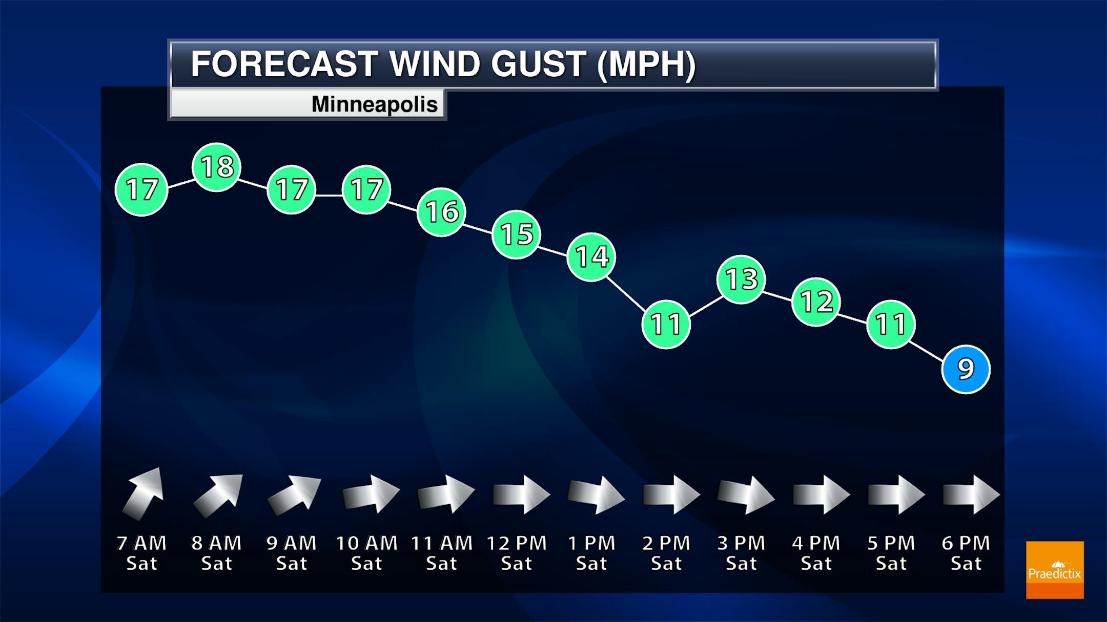 Here are the meteorgrams for Minneapolis on Saturday. Note that temps will warm quickly into the 70s by midday with reading topping out in the 80s by the afternoon. West to southwestern winds will be gusty up to 15mph to 20mph at times.