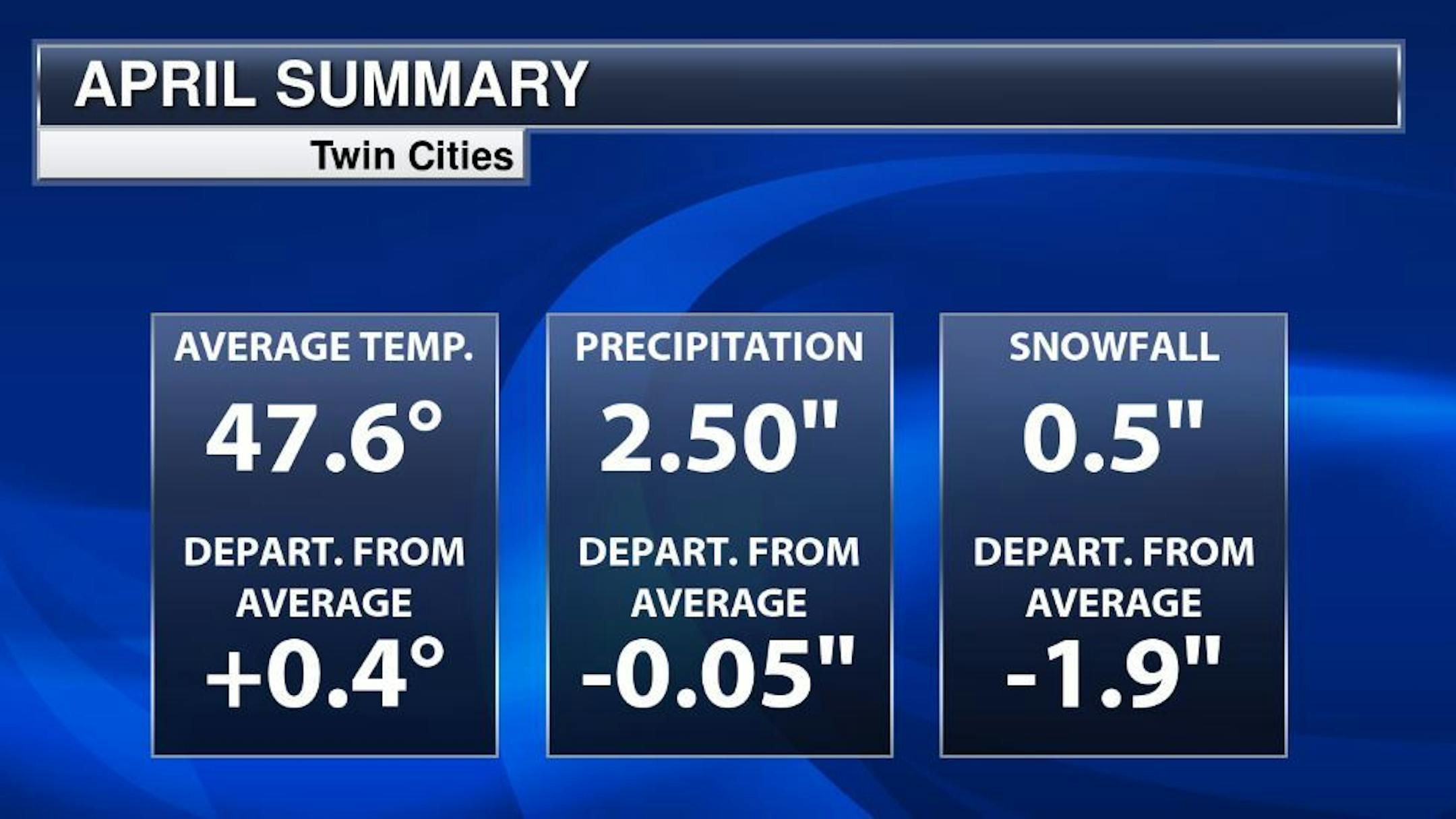 The Twin Cities weather summary for April, showed temps finishing only slightly above average. Total precipitation was also pretty close to average with snowfall amounts running below average by nearly -2.0".