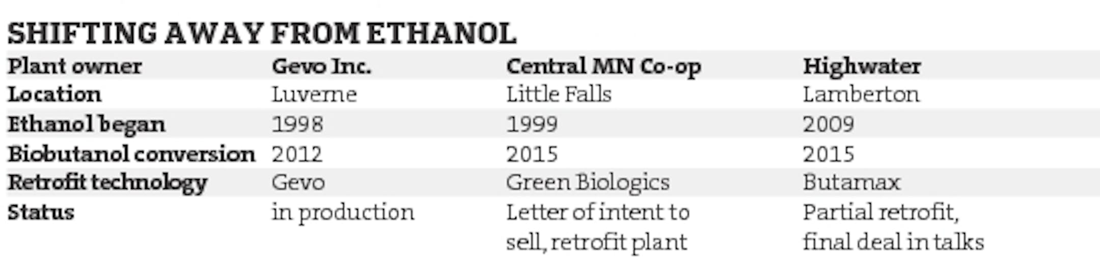 The hoped-for answer is ''yes'' for companies like Green Biologics, the U.S. unit of a British biotech firm. In September, it signed a letter of intent to acquire the Little Falls ethanol plant. The company intends to invest "tens of millions" to switch production to a chemical called normal butanol that sells for $6.50 per gallon vs. $2 per gallon for ethanol.