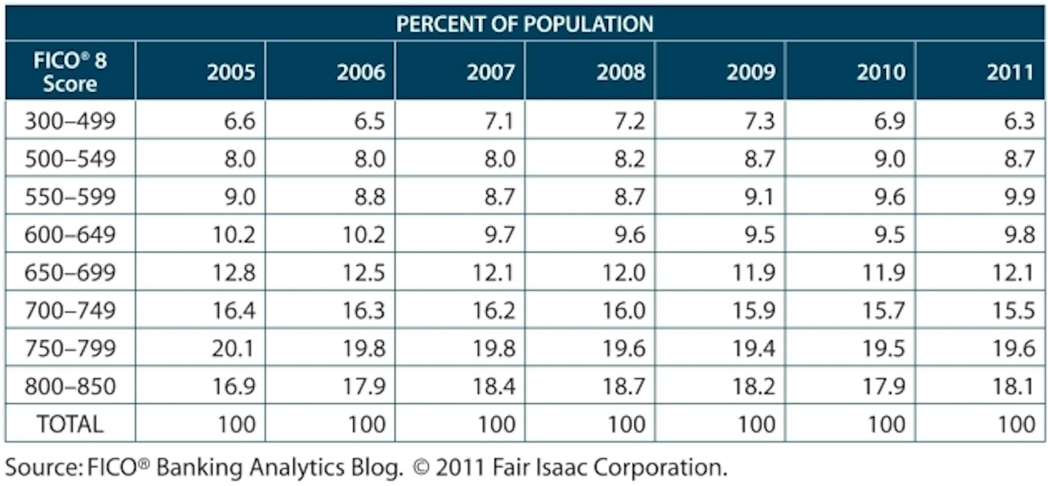 Today, FICO released a look at how FICO scores have shifted since 2005. The shifts are more nuanced than I expected, although a close look shows the recession increased the number of individuals at the top and bottom of the scoring range.