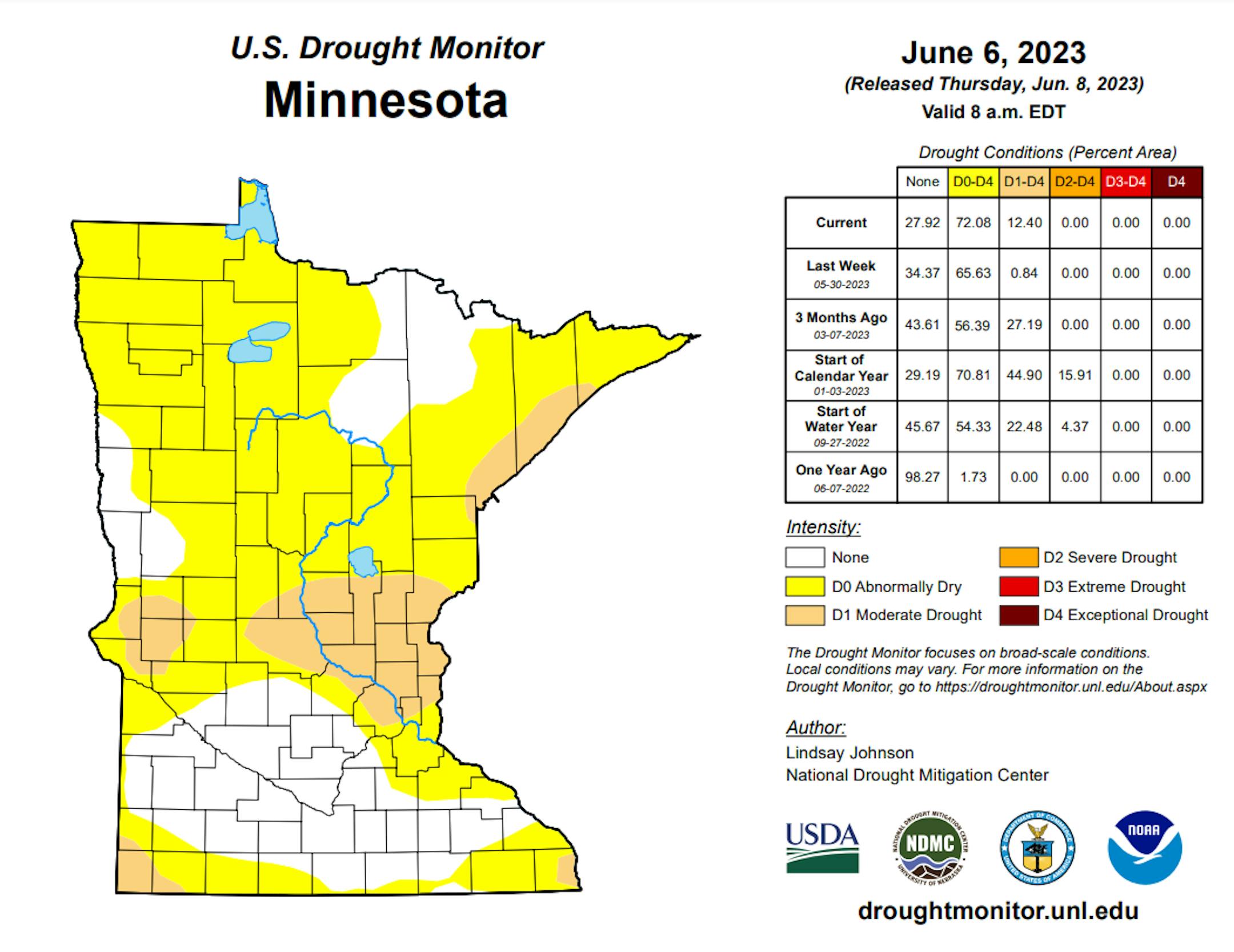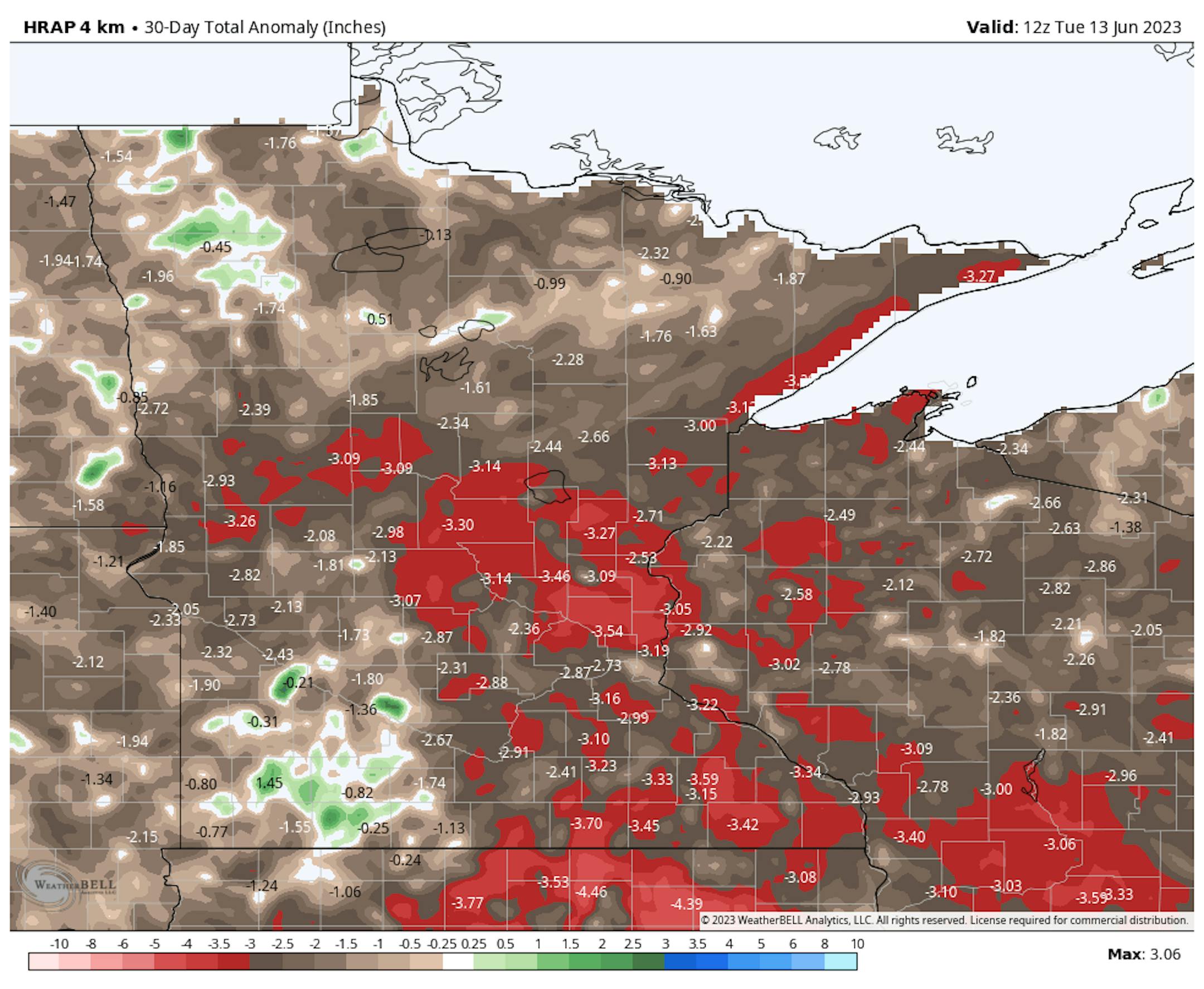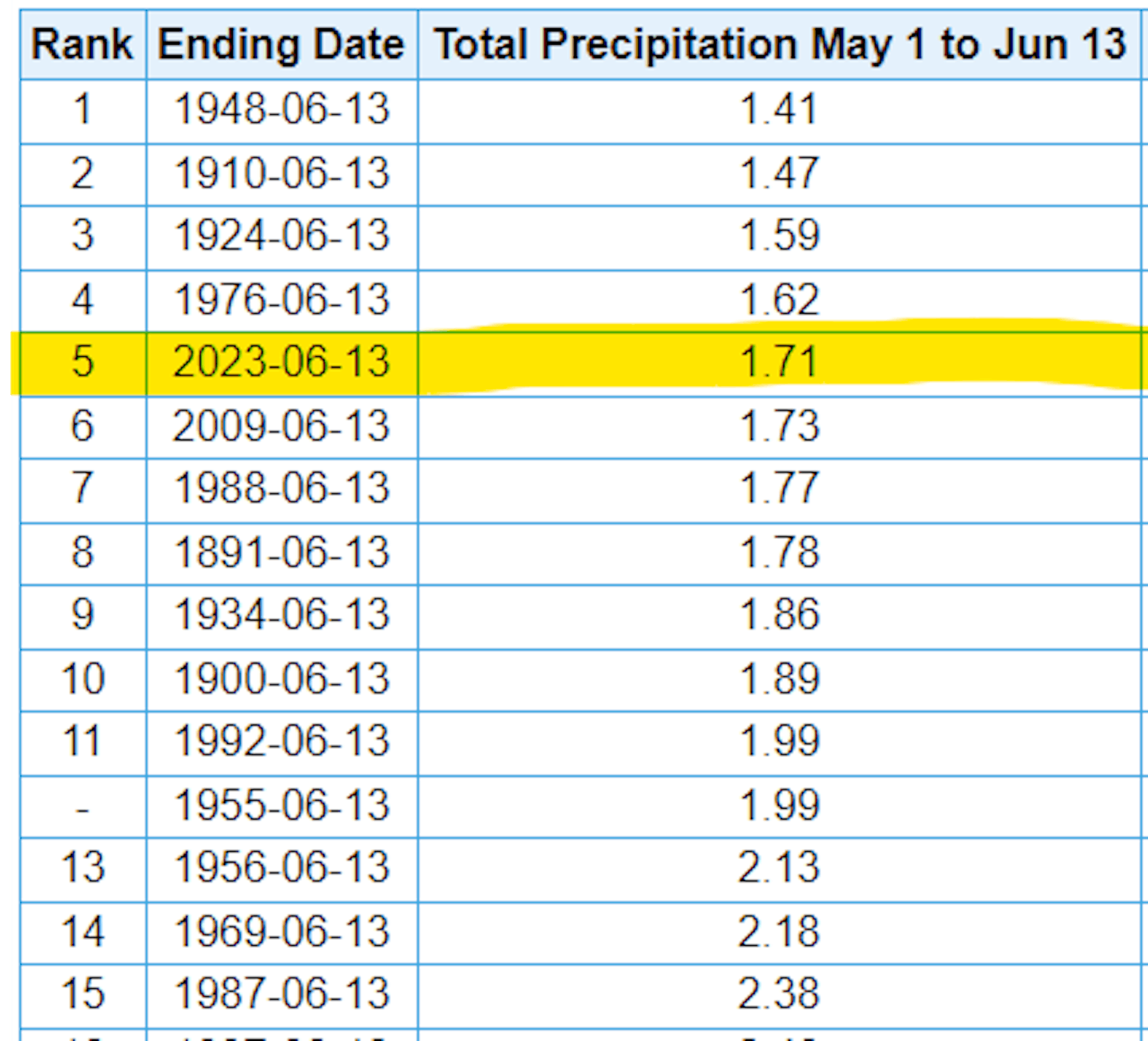 According to NOAA's NWS, this is the 5th driest May 1st through June 13th on record with only 1.71" of rain falling at the MSP Airport. Note that since May 1st, MSP should've had nearly 6.00" of rain, so we are more than 4.00" below average.