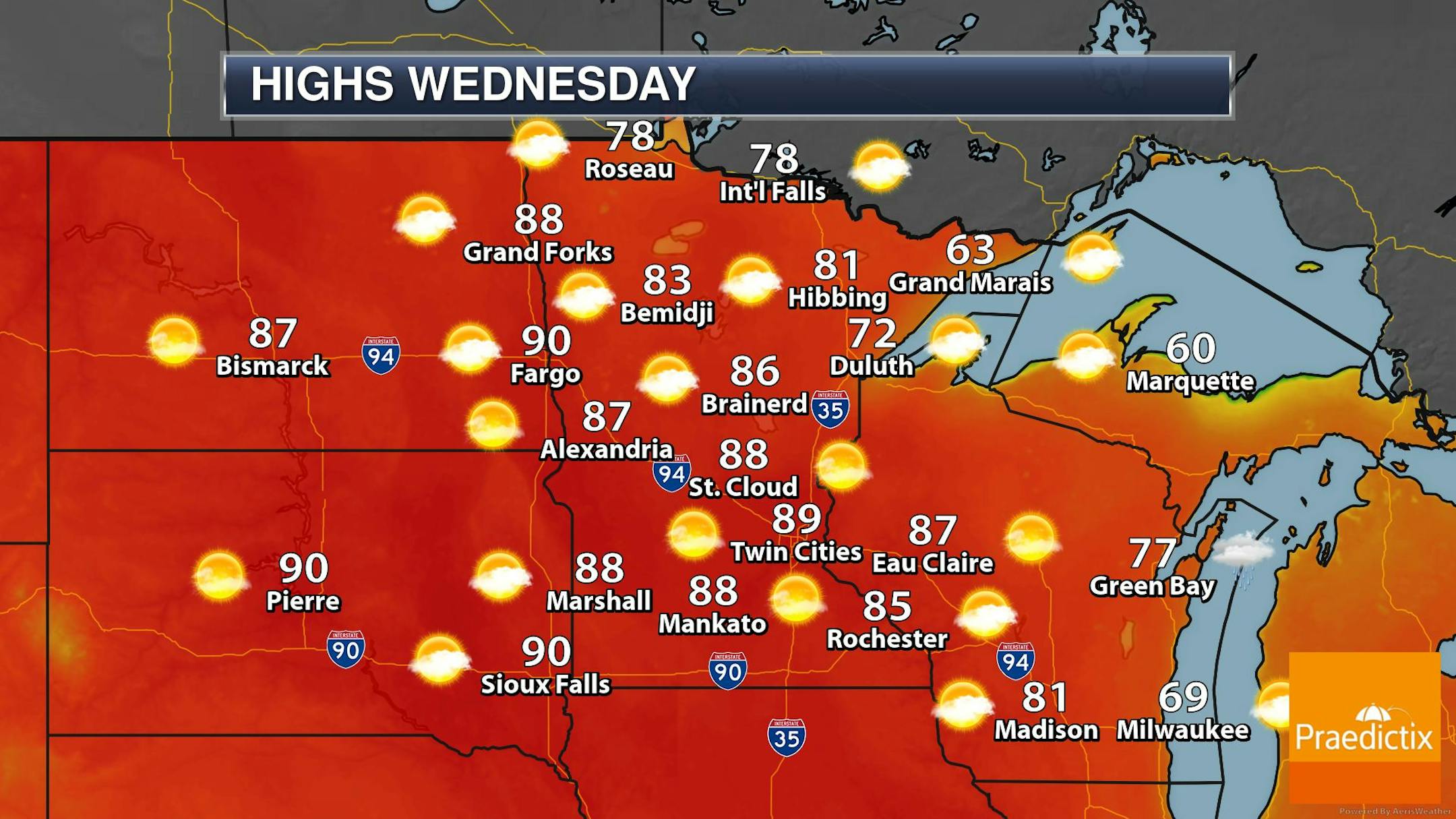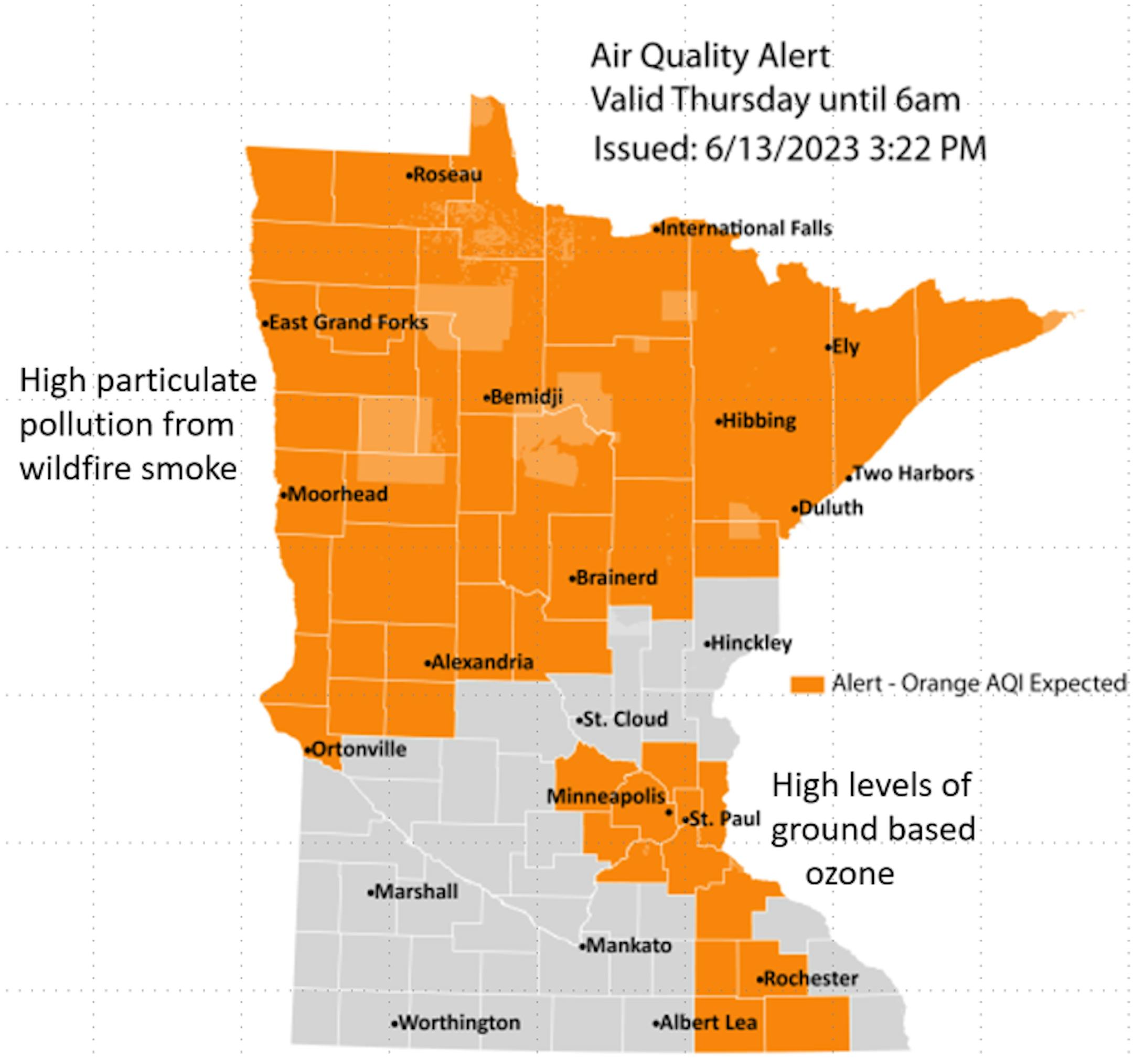 "Smoke from Canadian wildfires will move into northern Minnesota beginning Tuesday evening and will reach Brainerd and Alexandria by early Wednesday morning. The smoke will slowly move south during the day Wednesday and may approach St. Cloud in the evening. In addition, light smoke may move into southeast Minnesota on Wednesday evening. Winds will shift and push this smoke towards the west. Smoke will linger across much of the state throughout the day on Thursday, but concentrations should decrease below the orange category Thursday morning. In addition, sunny skies, warm temperatures, low humidity, and light winds will produce an environment for volatile organic compounds (VOC) and oxides of nitrogen (NOx) to react in the air to produce elevated levels of ozone in the afternoon. Ozone will be elevated across the Twin Cities and Rochester during the afternoon hours, but will decrease in the evening."