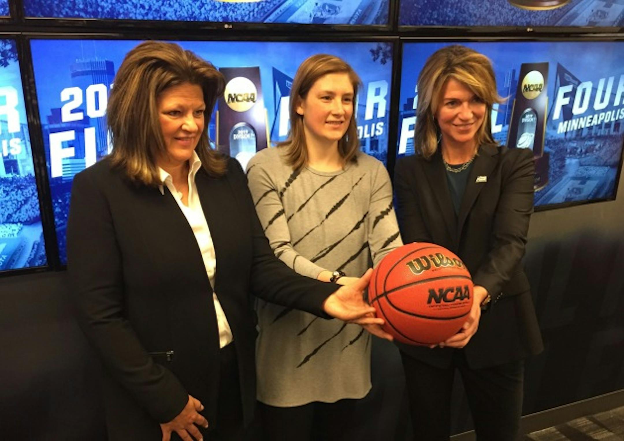 Minneapolis Mayor Betsy Hodges, NCAA managing director of men's basketball championships JoAn Scott, Gophers senior associate athletics director Tom McGinnis, and Lynx star guard and Gophers alum Lindsay Whalen were also involved in Tuesday's celebration.