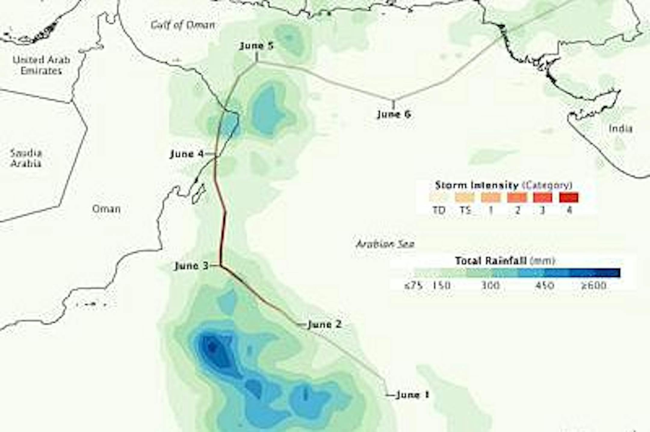 This TRMM satellite rainfall estimate mapshowed Cyclone Phet's heaviest rainfall (23.6 or more inches) occurred overopen waters of the Arabian Sea (blue). Northeast Oman received as much as 450mm (17.7 inches), while Pakistan received between 5.9 and 11.8 inches. Thecolored line indicates storm track and intensity. (Photo courtesy of NASA/Jesse Allen)