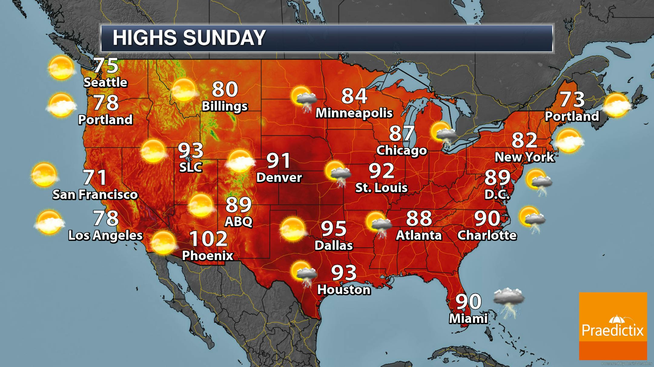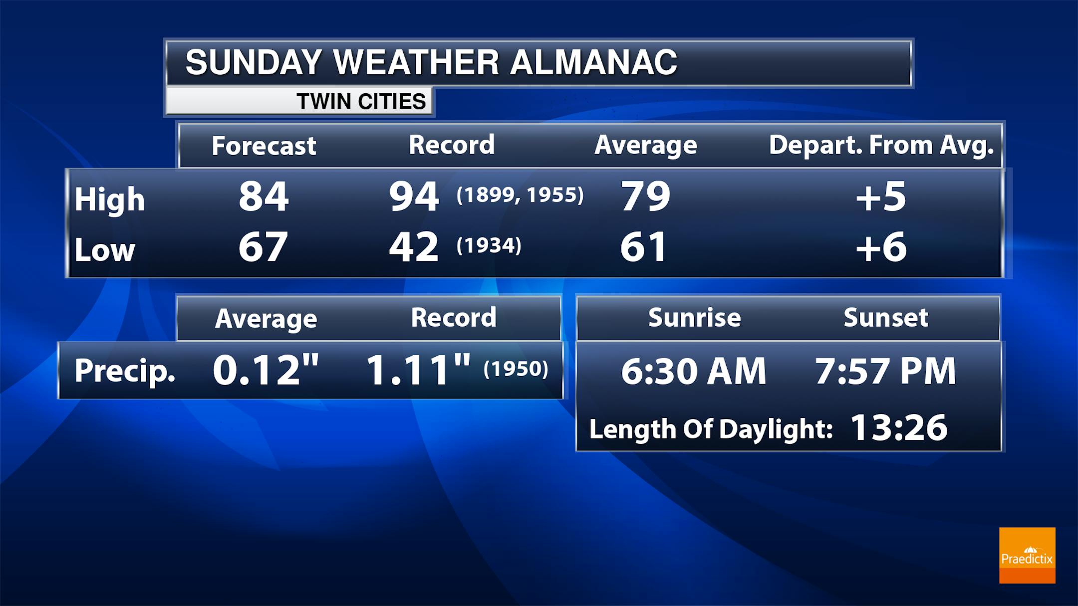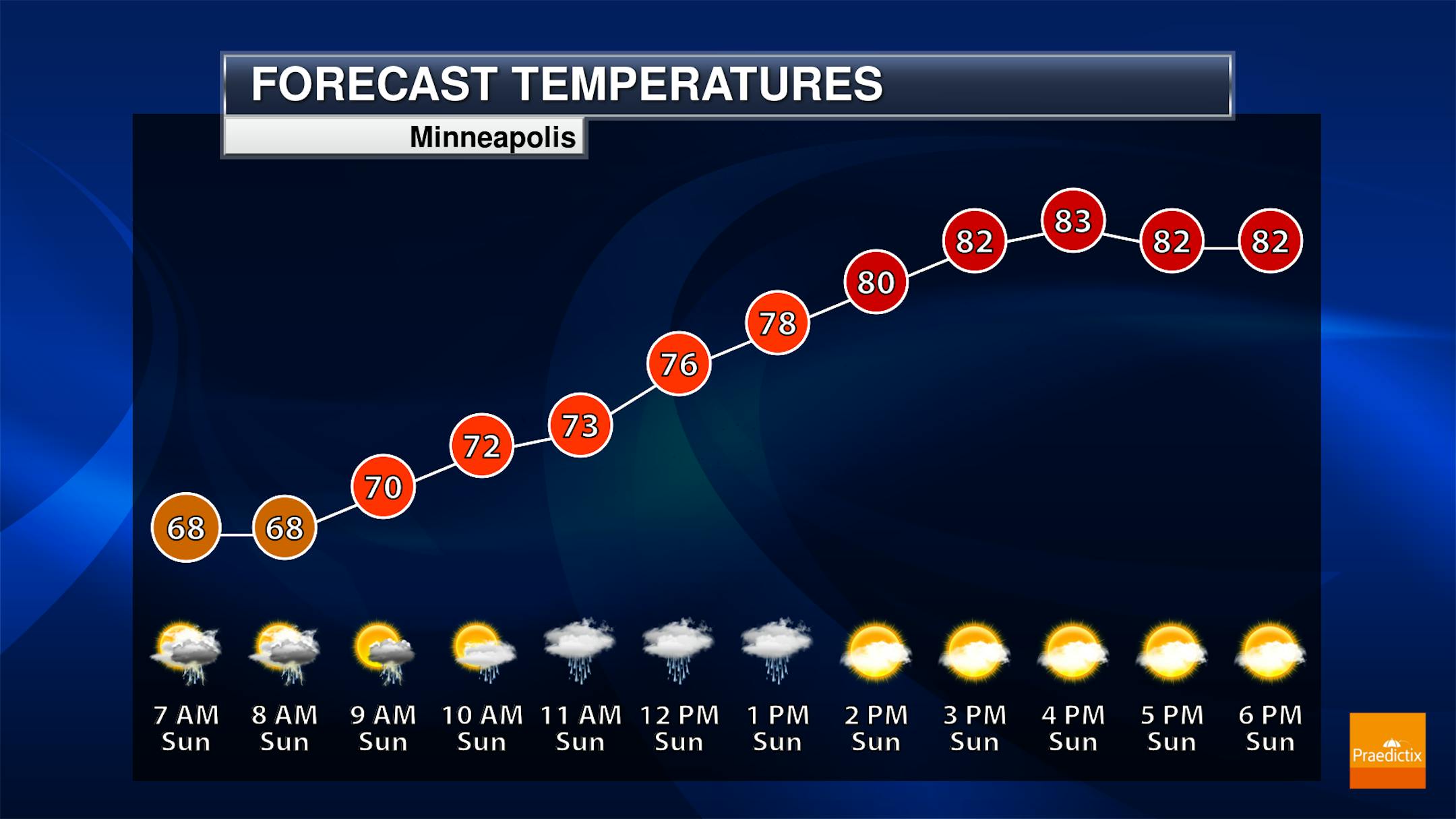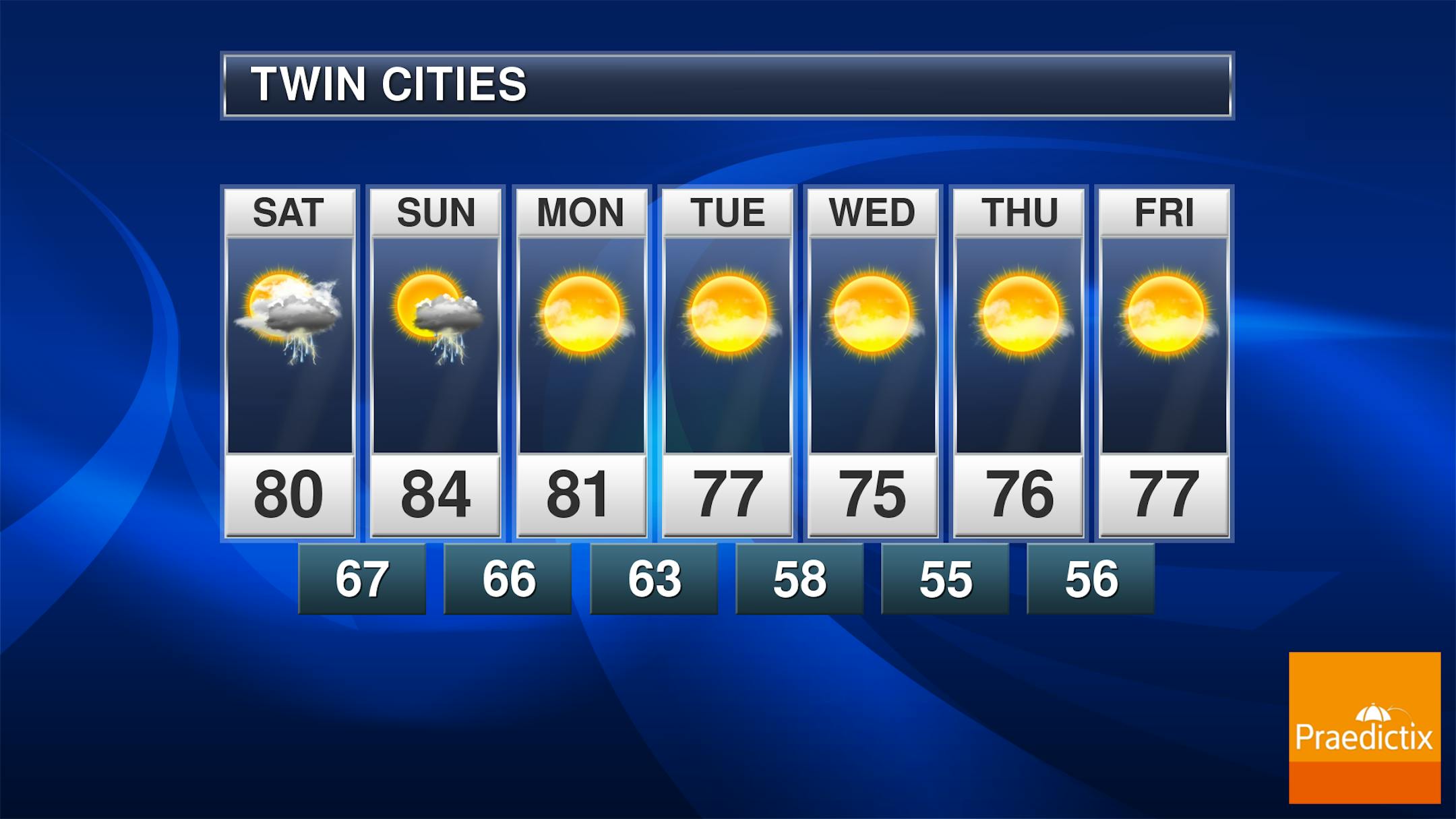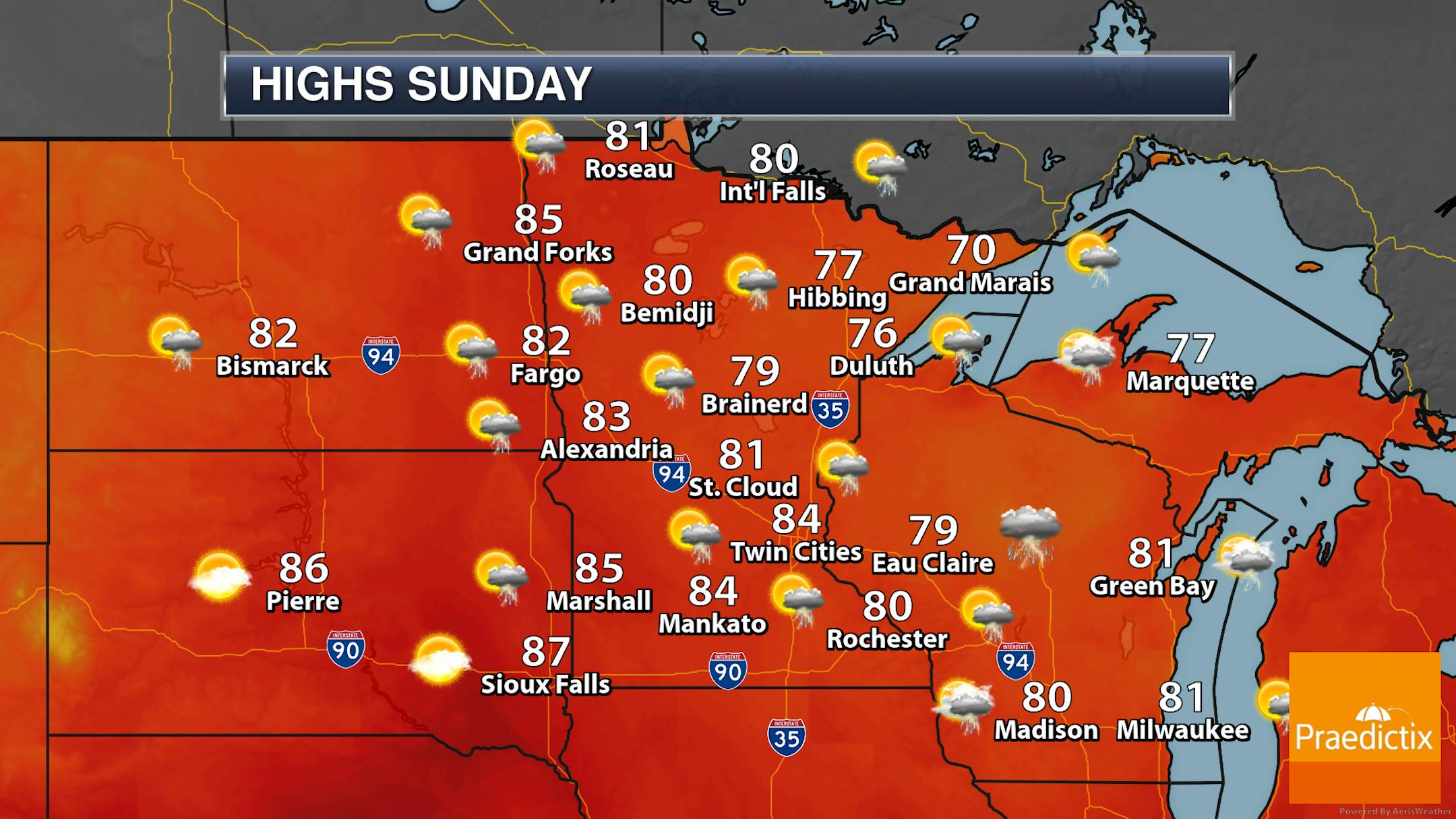 Besides those morning storms mainly across southeastern Minnesota, then the line of storms moving through late-day, a mix of sun and clouds to partly sunny skies can be expected to end the weekend. Highs will climb into the 70s and 80s as we head through the afternoon hours across the state.