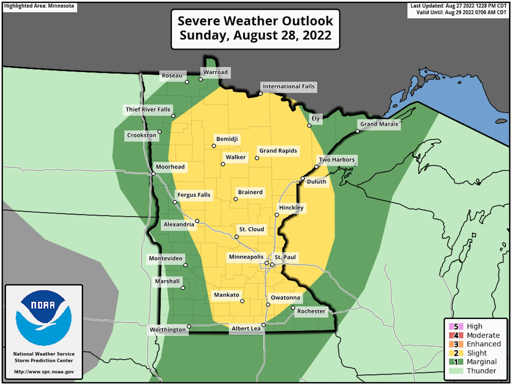 Due to that line of storms expected to move across the state on Sunday, a good part of the state is under some sort of a severe weather threat, including a large Slight Risk stretching from the Canadian border south to almost Iowa. Wind and hail will be the greatest threats.