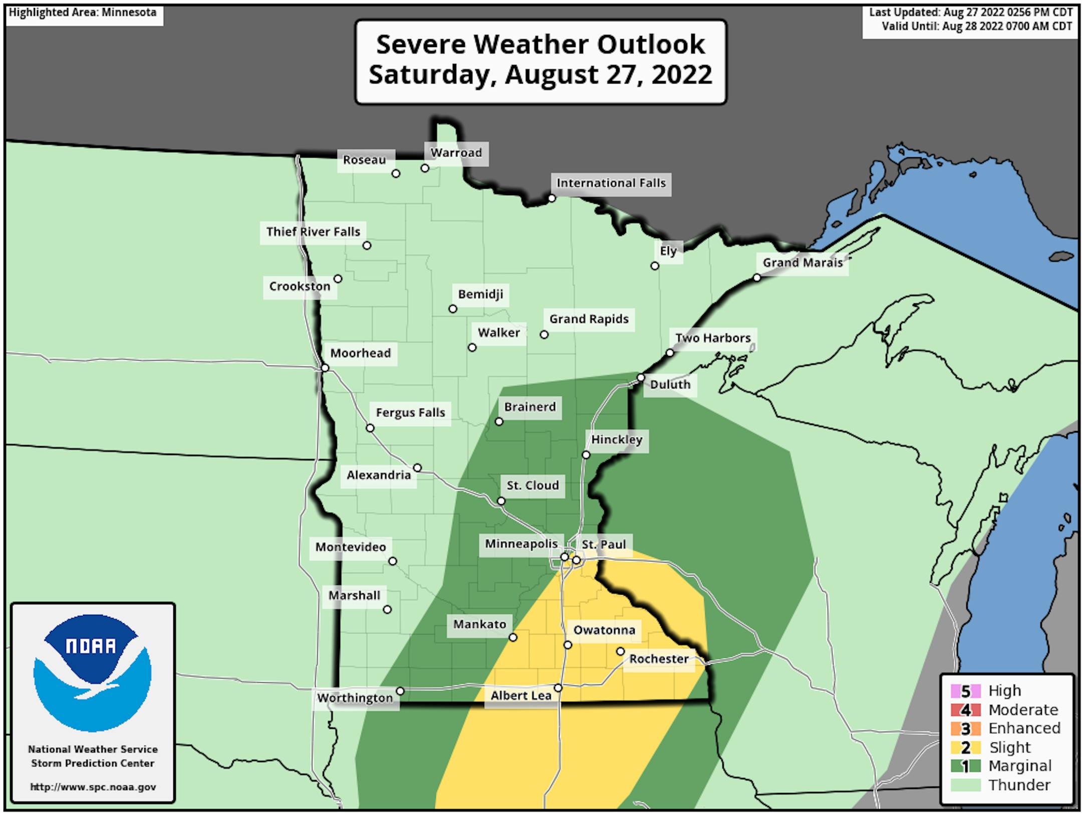 Due to the severe weather threat Saturday evening/night, a Slight Risk of severe weather is in place across southern Minnesota - including portions of the Twin Cities metro. Hail and wind are the greatest threats. A tornado or two can't be ruled out, mainly across parts of central Minnesota.