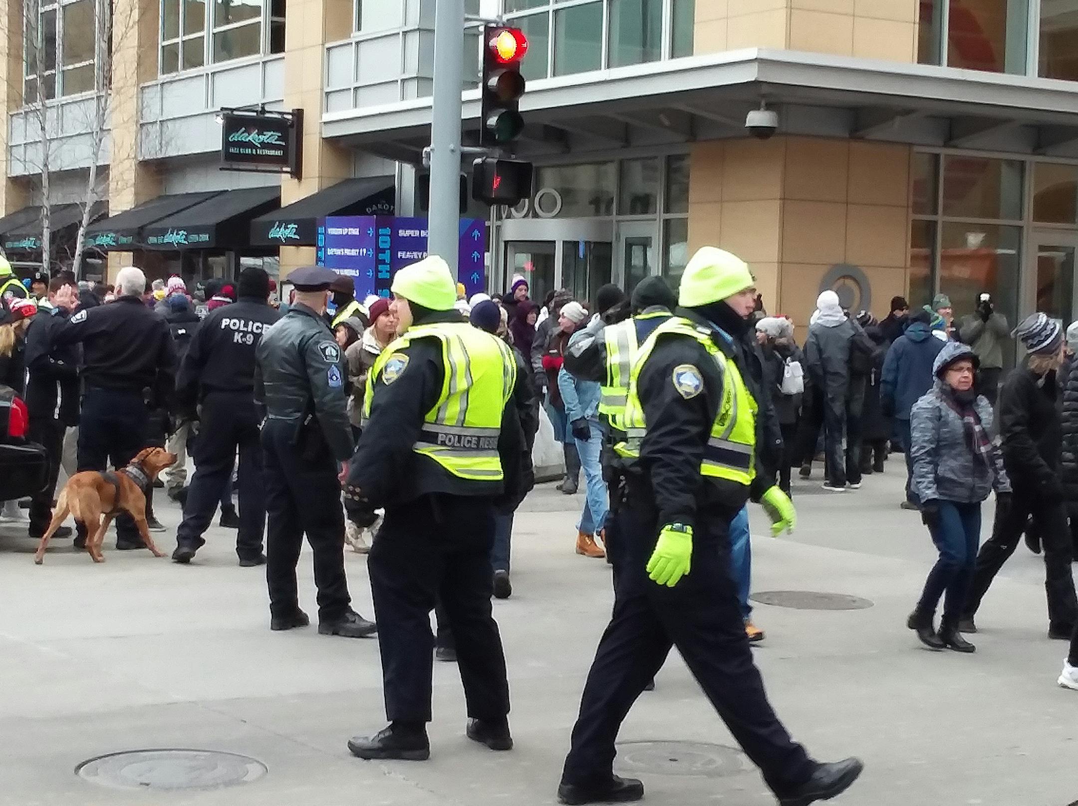 Many police are busy directing traffic on the cross street of Nicollet Mall where the LII Super Bowl free concerts and other events are taking place. (The Minnesota Star Tribune)