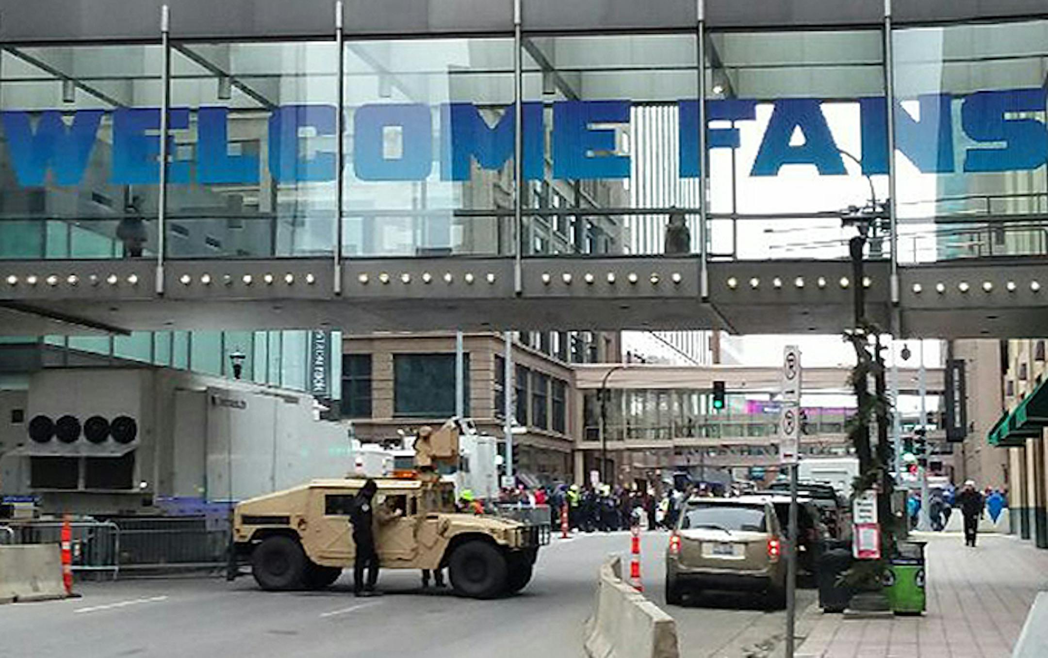 A military humvee drove out to the road to block the upcoming traffic before police officers directing pedestrians crossing the road to Super Bowl events on Nicollet Mall. (The Minnesota Star Tribune)