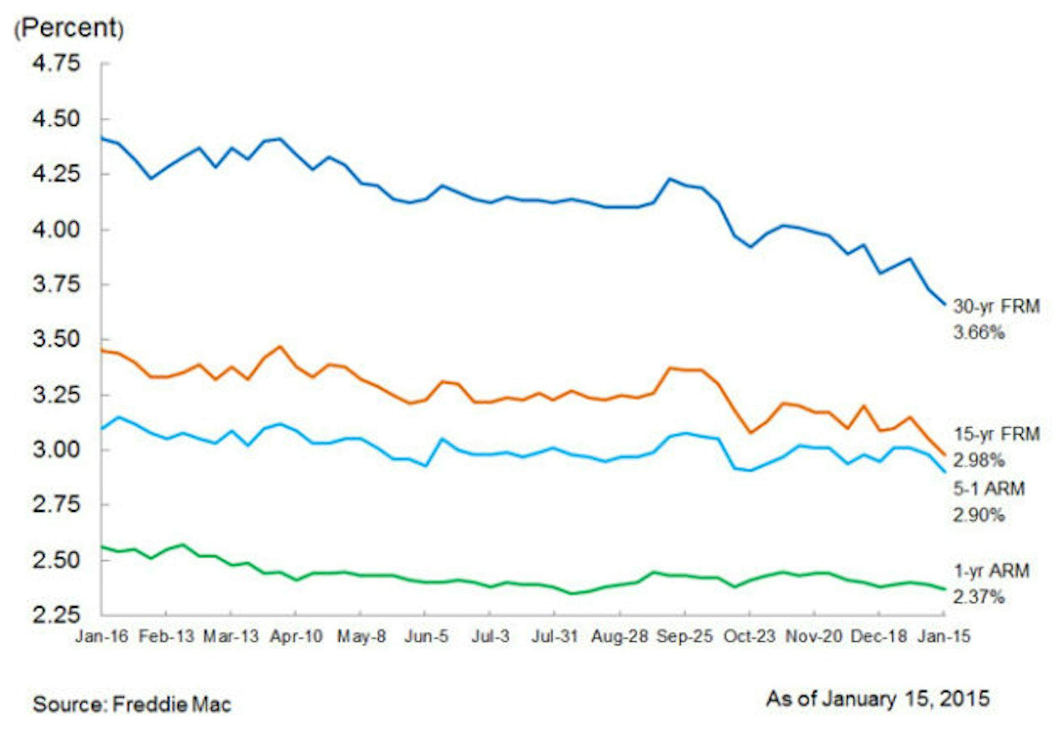 Mortgage interest rates fell for the third consecutive week, and borrowers have taken note - mortgage applications surged last week mostly because of an increase in refinancing activity. The 30-year fixed-rate mortgage averaged 3.66 percent during the week ending Janary 15, the lowest level since May 2013 when it averaged 3.59 percent, according to Freddie Mac's Primary Mortgage Market Survey. It was also the first time the 15-year fixed rate mortgage dipped below 3 percent since the week ending May 30.