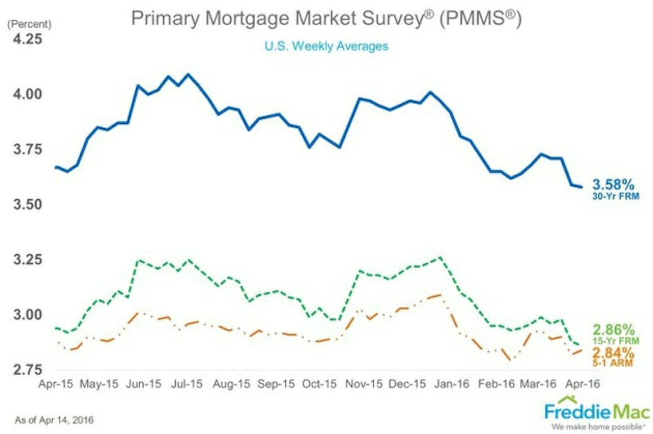 Mortgage interest rates dipped to new 2016 lows and the lowest rates since May 2013, according to a weekly survey of national mortgage rates by Freddie Mac. For the week ending April 14 the 30-year fixed-rate mortgage (FRM) averaged 3.58 percent with an average 0.5 point, down from last week when they averaged 3.59 percent. A year ago at this time, the 30-year FRM averaged 3.67 percent.