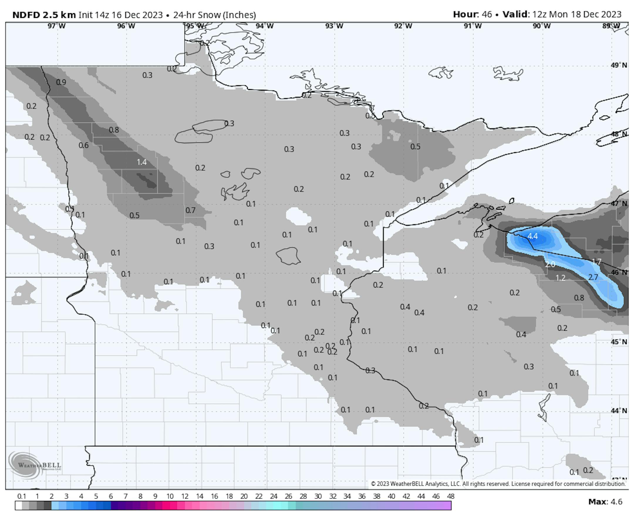 As you can see, snow totals toward the metro are expected to be light with maybe a tenth or two of an inch... but at this rate this winter, that's something to get somewhat excited about. The heaviest totals will be up in parts of northwestern Minnesota, where totals up to around 1.5" are possible. I would not be surprised to see some heavier snow totals around that amount along the higher terrain of the North Shore as well.