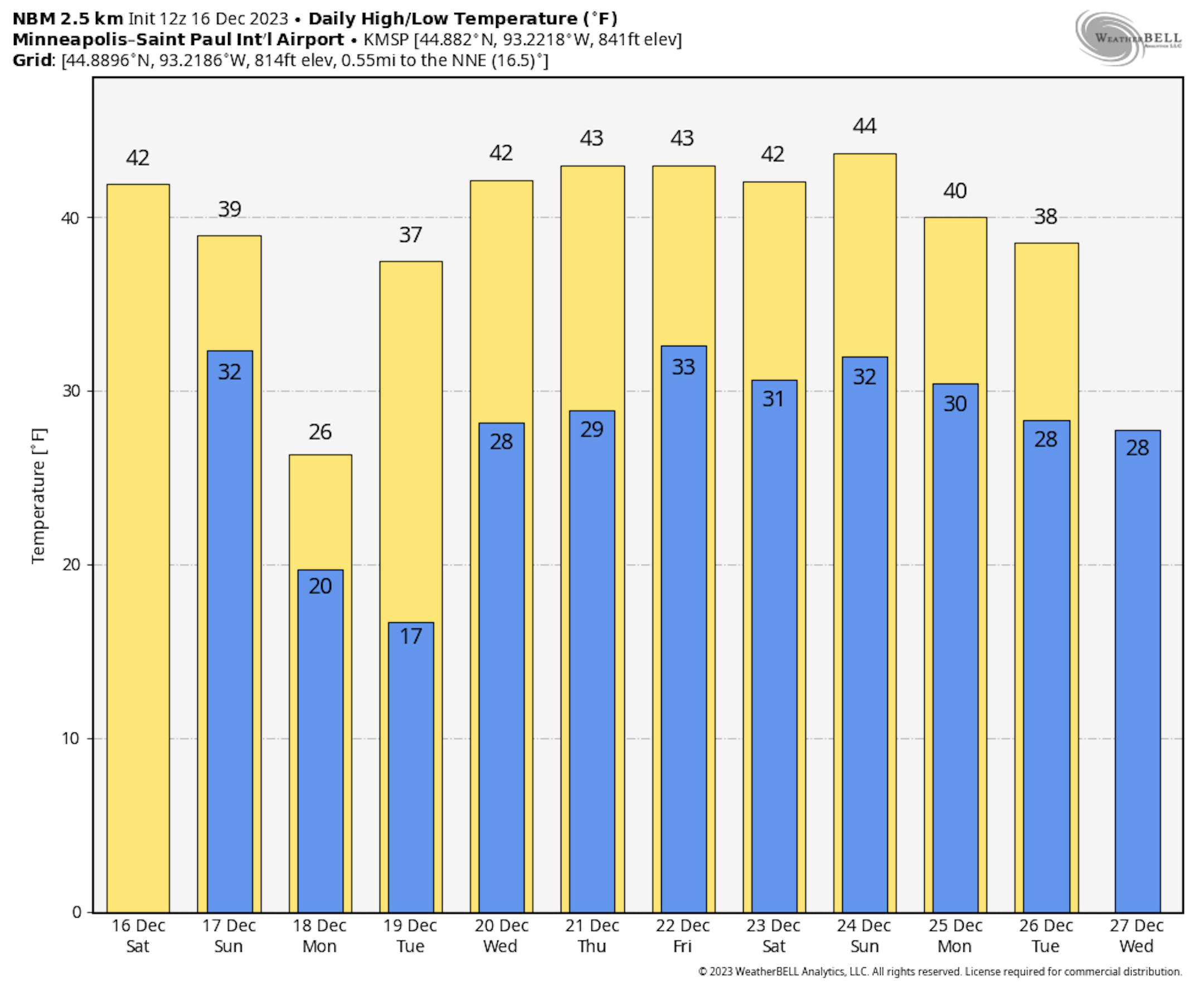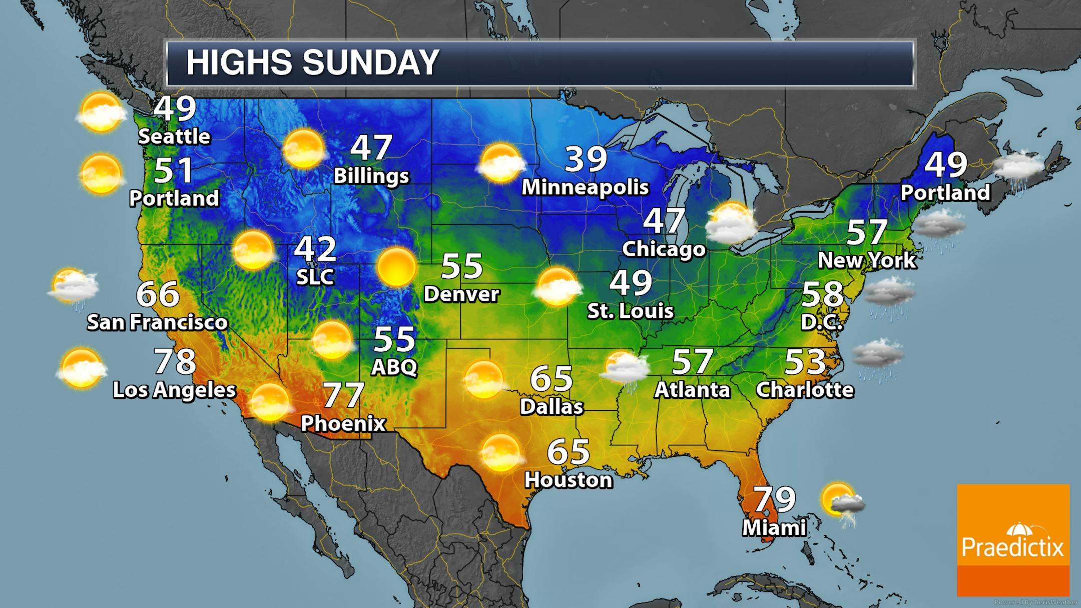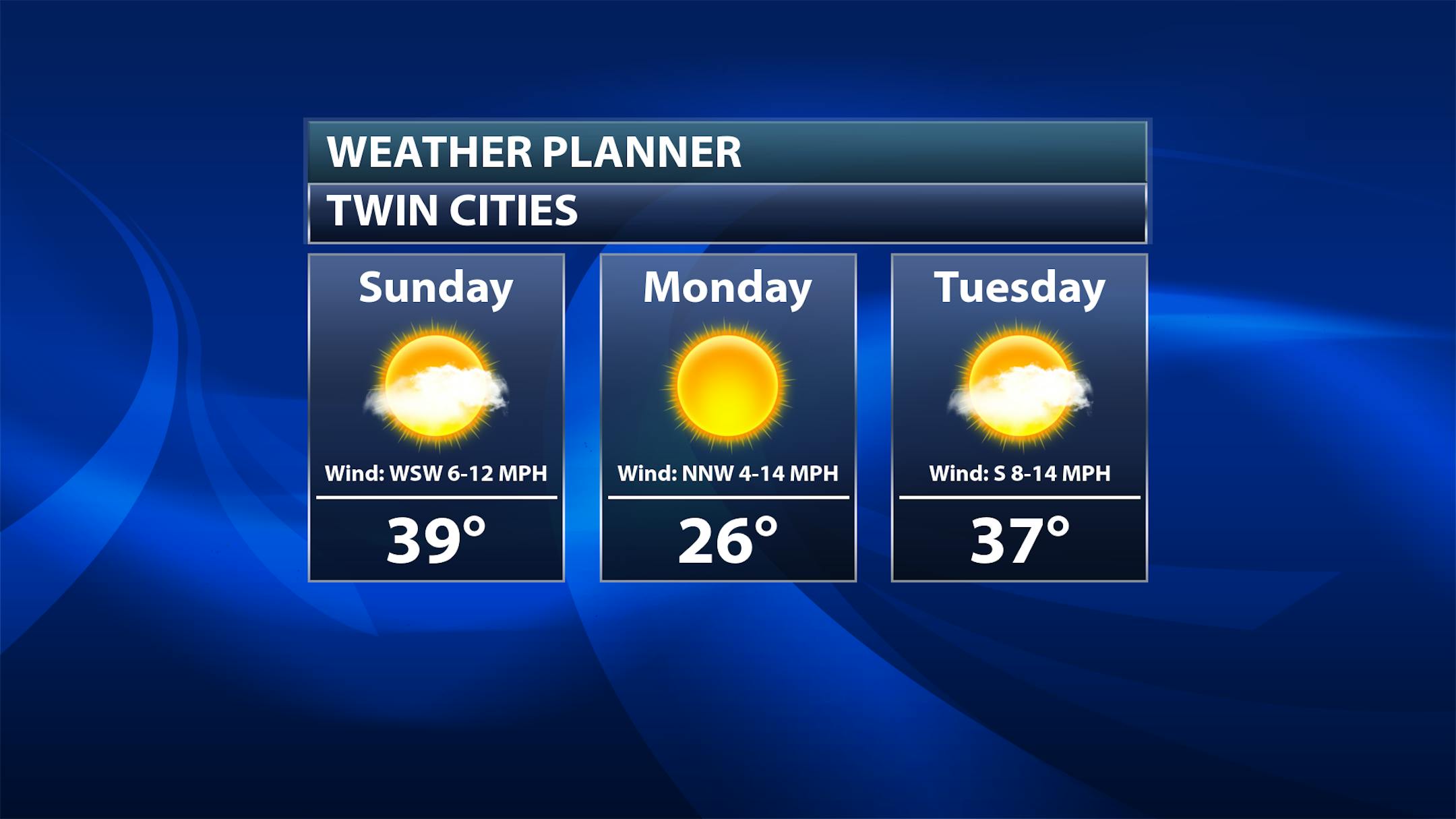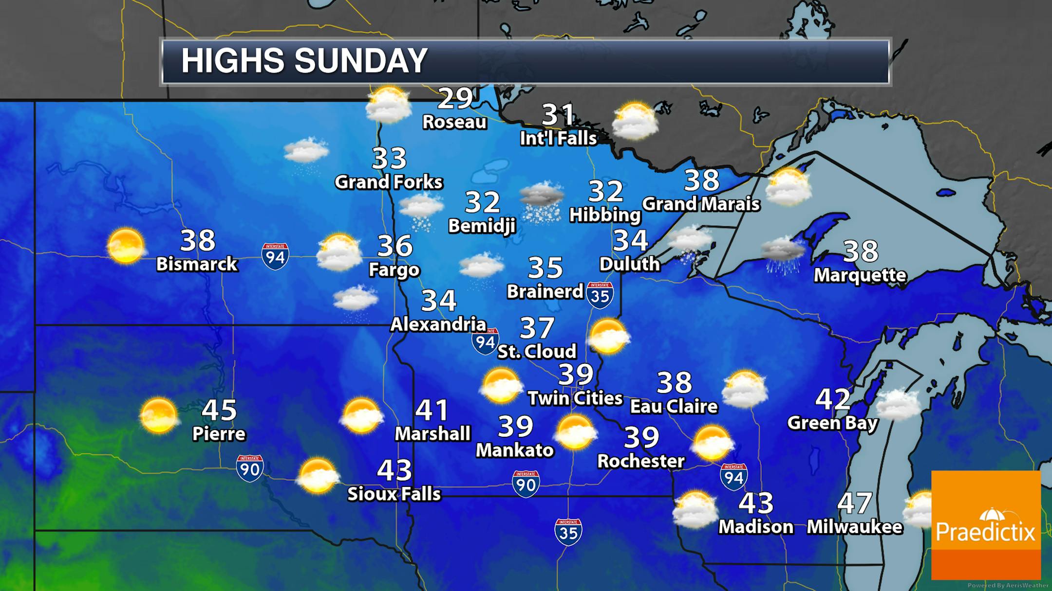 We'll keep an eye on that system moving into the region throughout the day, bringing snow chances to mainly northern/central Minnesota in the afternoon hours before snow chances spread a little farther south into the evening and overnight hours. Otherwise, mainly cloudy conditions are expected to end the weekend. Highs range from the upper 20s in far northern Minnesota to the low 40s in southwestern areas of the state.