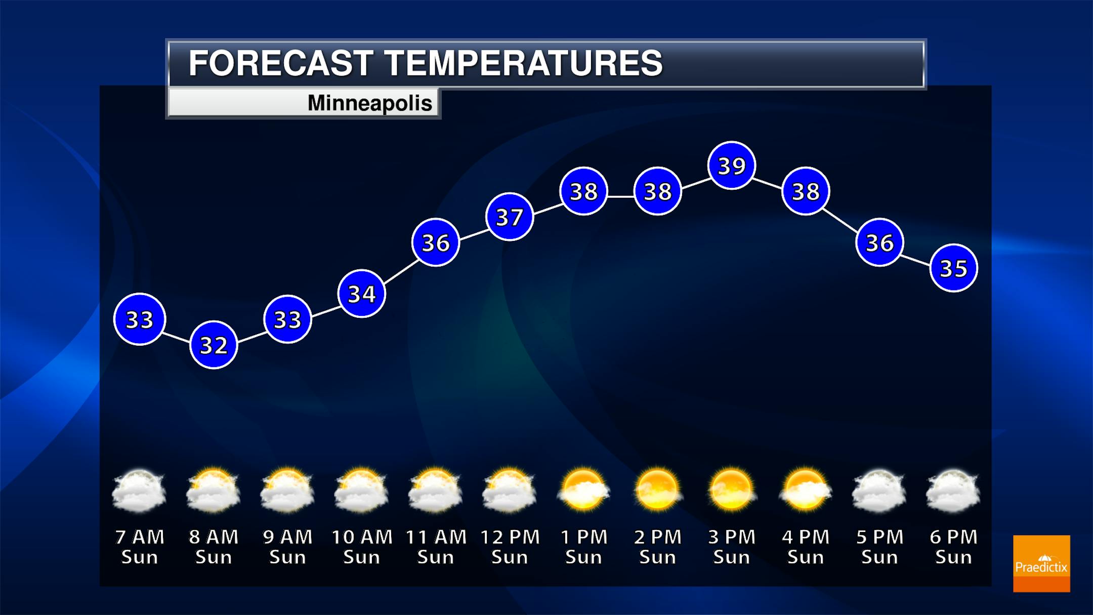 So while we'll keep an eye on that snow chance toward the evening and overnight hours here in the metro on Sunday, skies will be mainly cloudy throughout much of the day. I can't rule out a few-hour period in the afternoon where there is more sun than clouds. Temperatures hover in the 30s throughout the day.