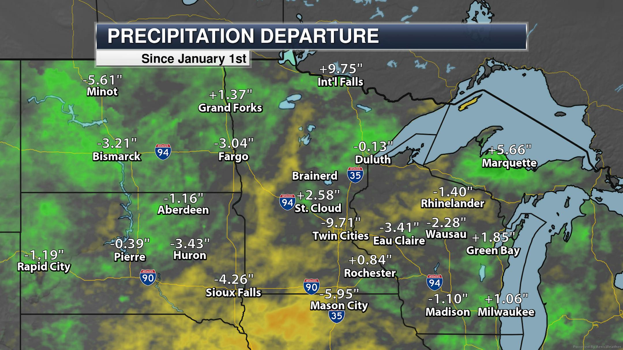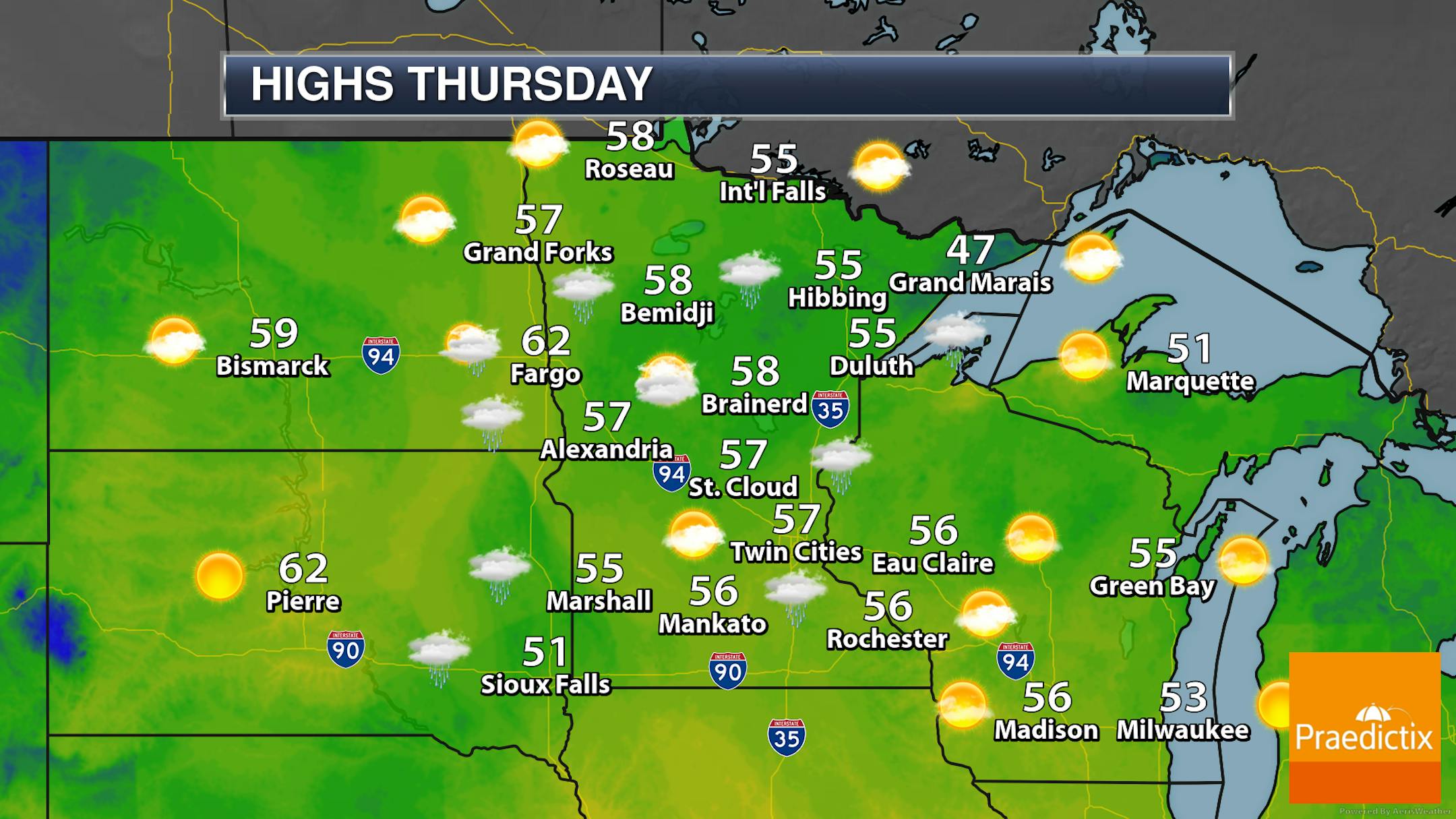 So we watch those very light rain/sprinkle chances mainly north and west of the metro (maybe in southeast Minnesota as well) as highs climb into the 50s across much of the state. These highs on Thursday will range from around average to up to 15F degrees above average.