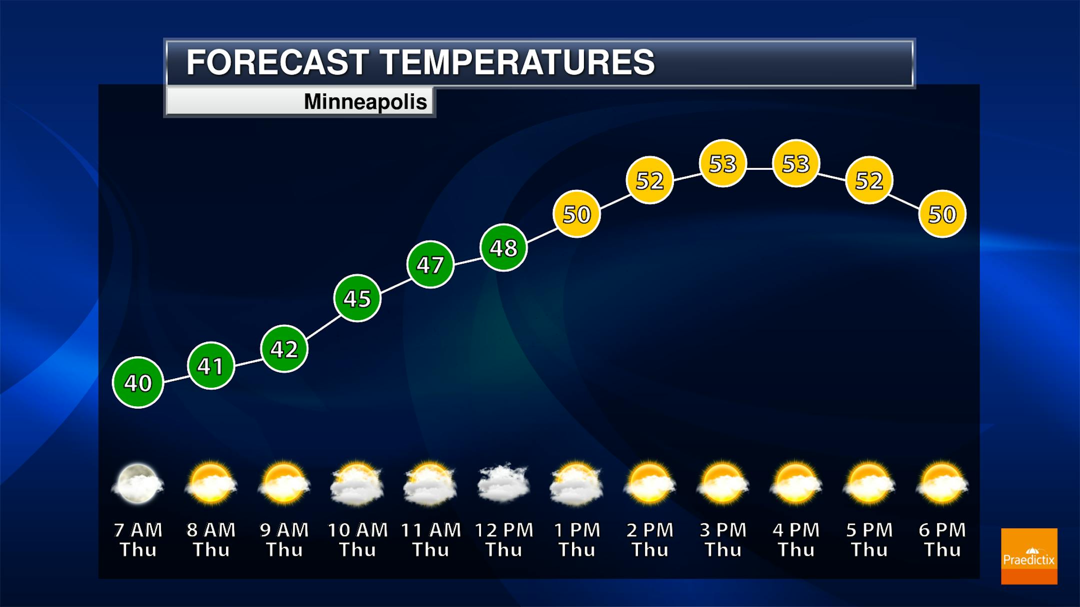 As we look closer to the Twin Cities on Thursday, I expected mostly cloudy skies - but we should squeeze out a least a few peeks of sunshine during the day. Temperatures climb from around 40F as the kids head to the bus stop to the mid-50s by the time they come home.