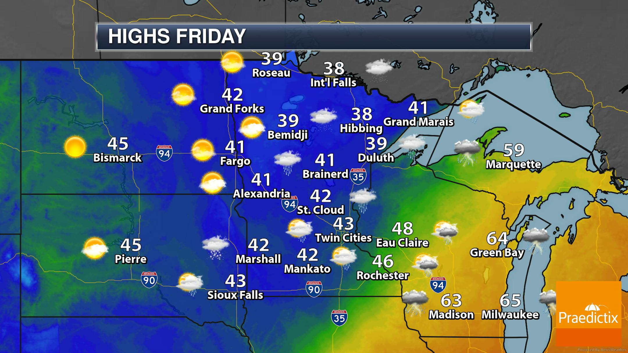 Note that if you're planning on heading out Thursday evening or during the overnight hours there will be a few showers around with the first wave of moisture due to a cold front moving through the region. By Friday morning, a few snowflakes could mix in mainly north and west of the metro.