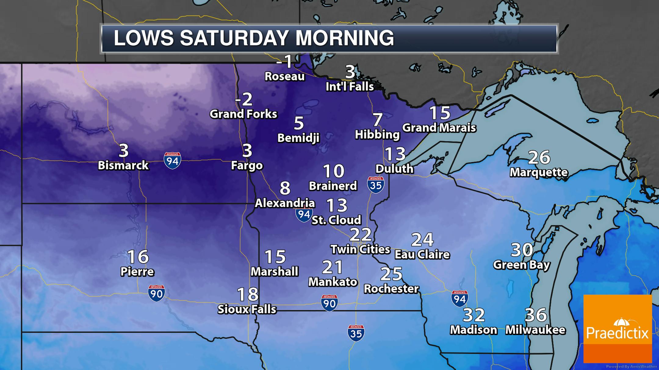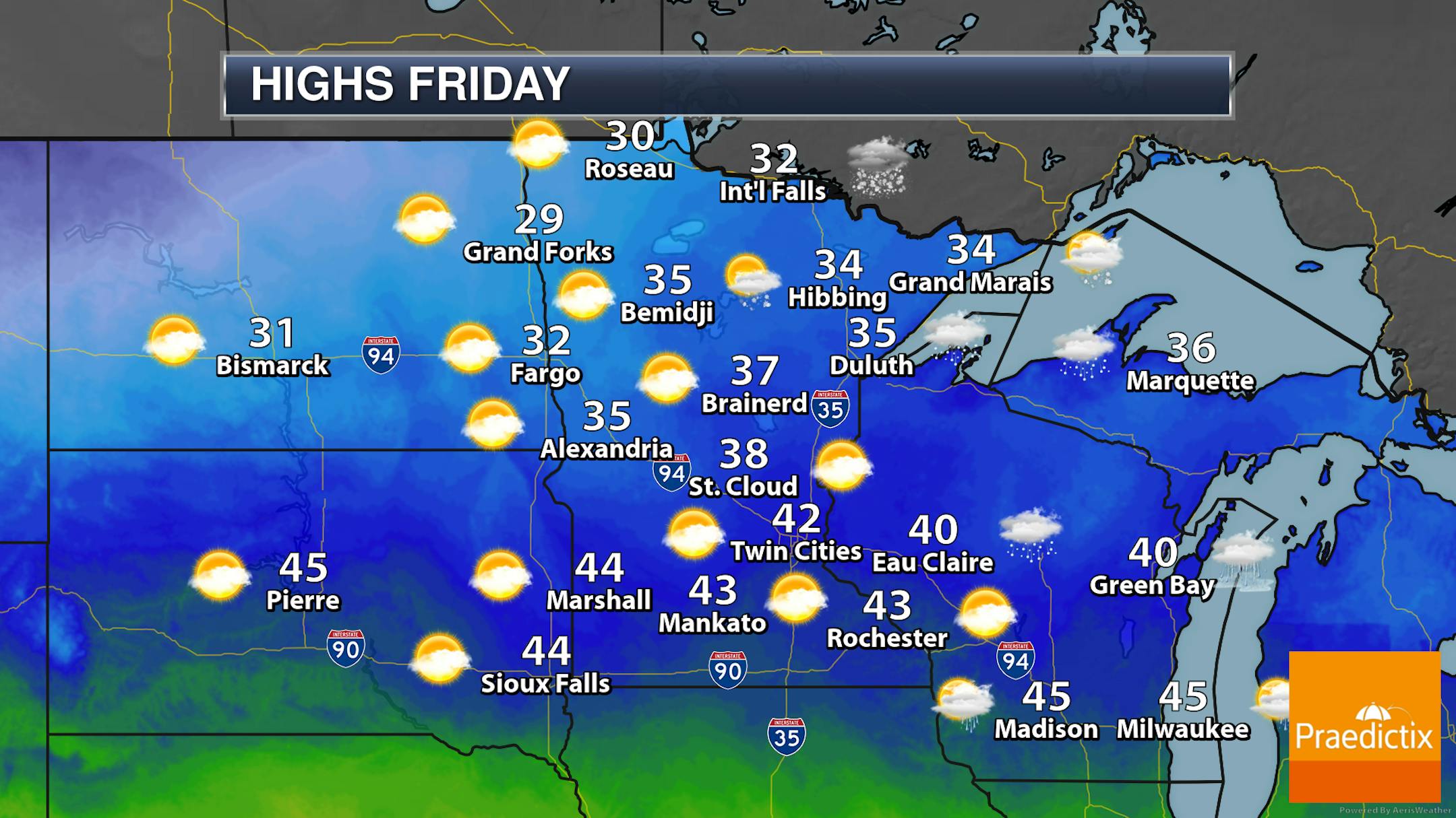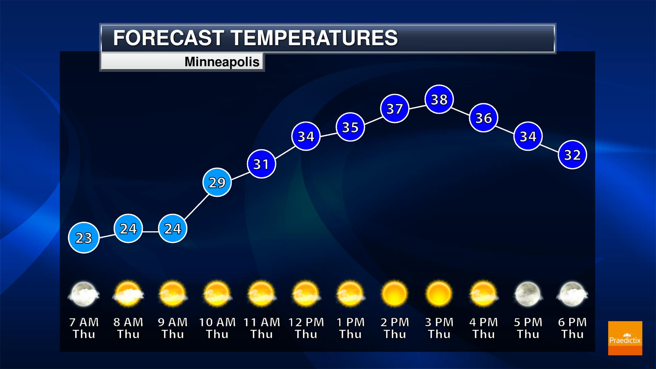 There will be a better chance of snowflakes across northern Minnesota as we head through the morning and midday hours Thursday, with up to 2" possible in northwestern portions of the state. Sunnier skies are expected as you head south. Temperatures range from the 20s up north to the low 40s in southwestern Minnesota.