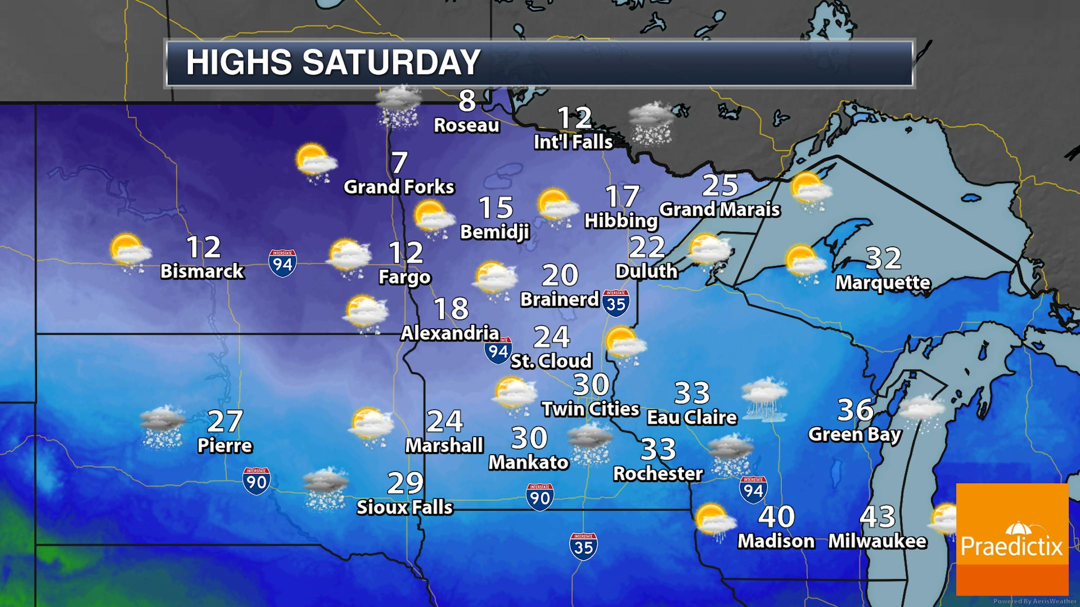 Christmas Eve looks to be quiet in the Twin Cities as temperatures climb into the low 40s with partly cloudy skies. We will watch the chance of some wintry precipitation (snow or ice) across portions of northern Minnesota as a system passes just north of the border.