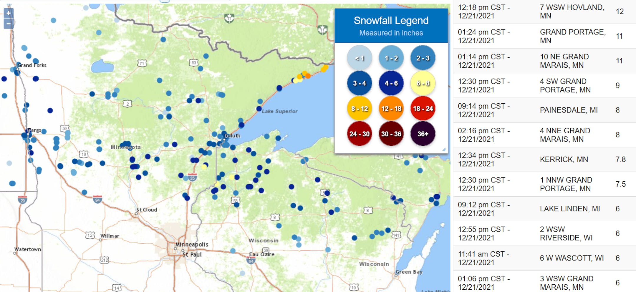 Officially 0.6" of snow fell Tuesday at the Twin Cities airport from the system that moved through the region, but heavier totals fell as you went north - particularly along portions of the North Shore. A foot of snow was reported near Hovland with 11" in Grand Portage.