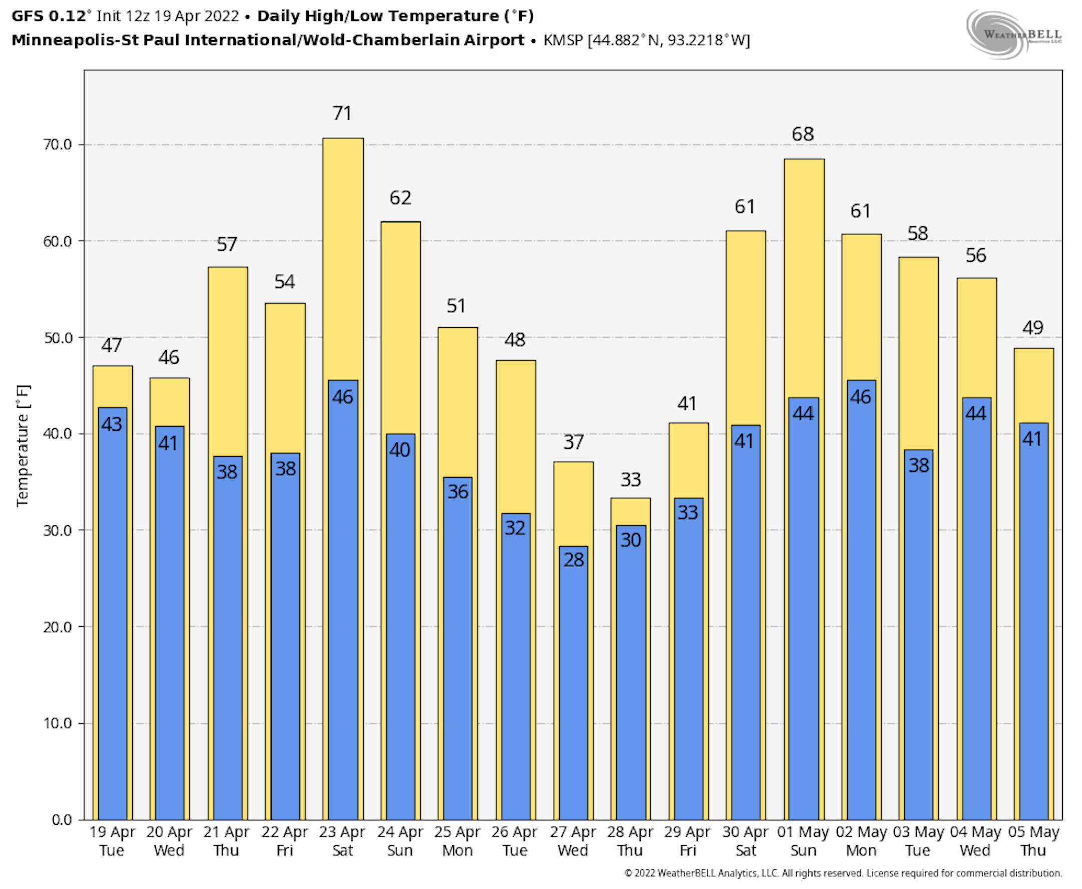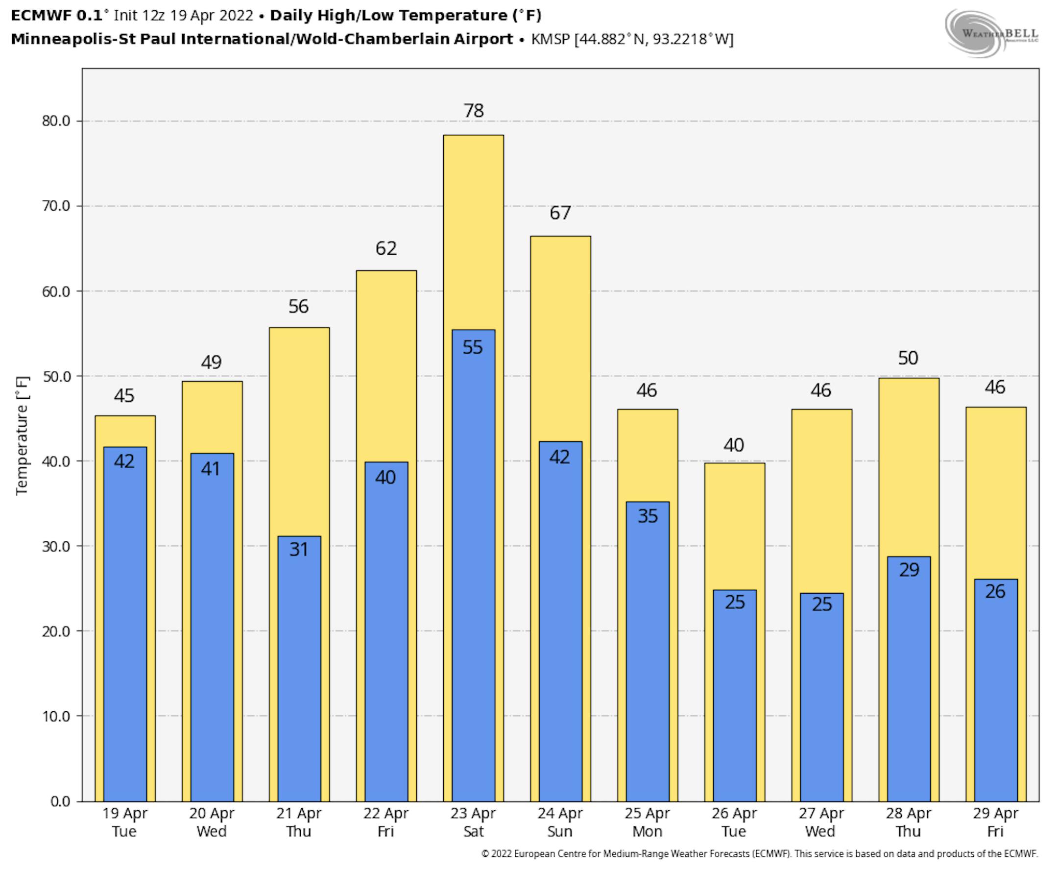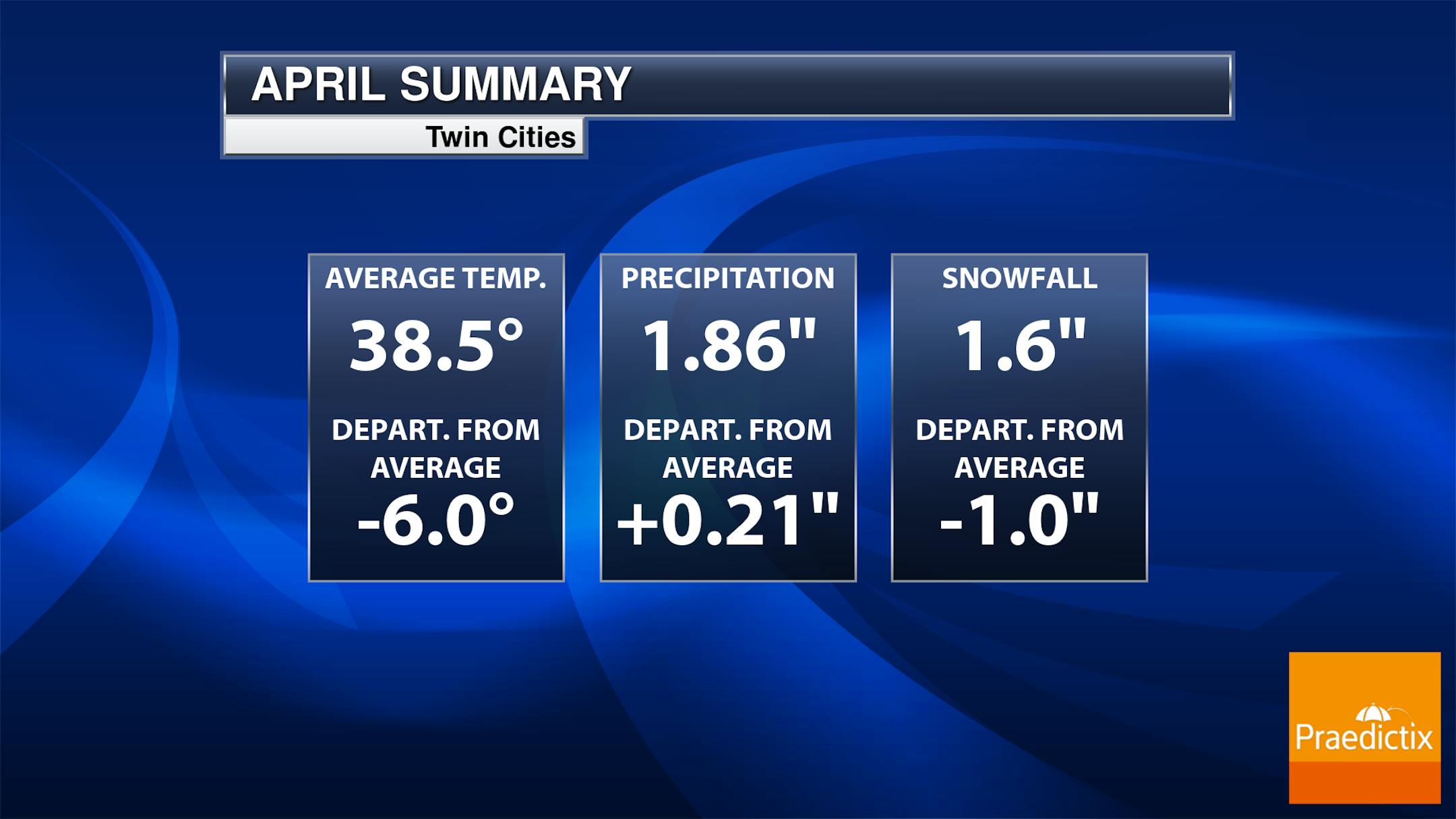 Here's the Twin Cities weather summary for April so far. Note that we're running nearly -6.0F below average so far this month, which is tied for the 26th coldest start to any April on record. We're about 0.20" of an inch above average in terms of precipitation, but nearly -1.0" below average in terms of snowfall.