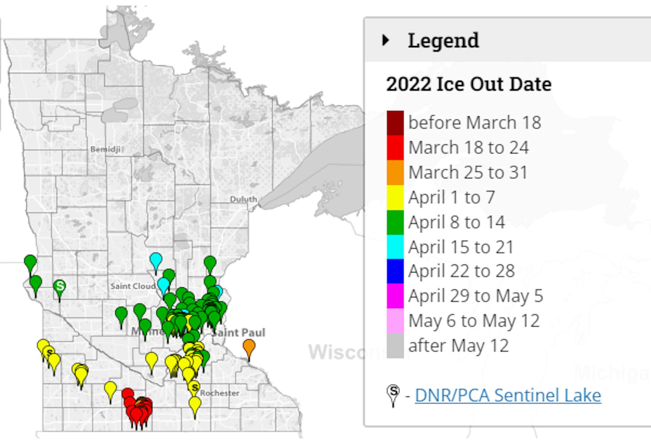 Hey - Look at that! More and more lakes are going ice out in the southern part of the state. However, thanks to a chillier than average month of April so far, several lakes are going out a little later than average. Cedar Lake, Lake Nokomis and Medicine Lake in the metro are officially out. According to the MN DNR, Lake Minnetonka went ice out on April 15th, 2 days later than normal (April 13th). Look for more ice outs over the coming days and weeks. It won't be long now before the land of 10,000 unfrozen lakes returns!