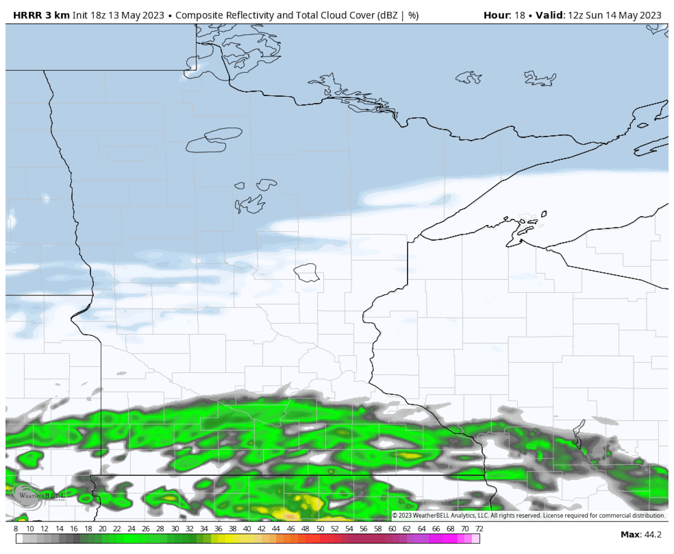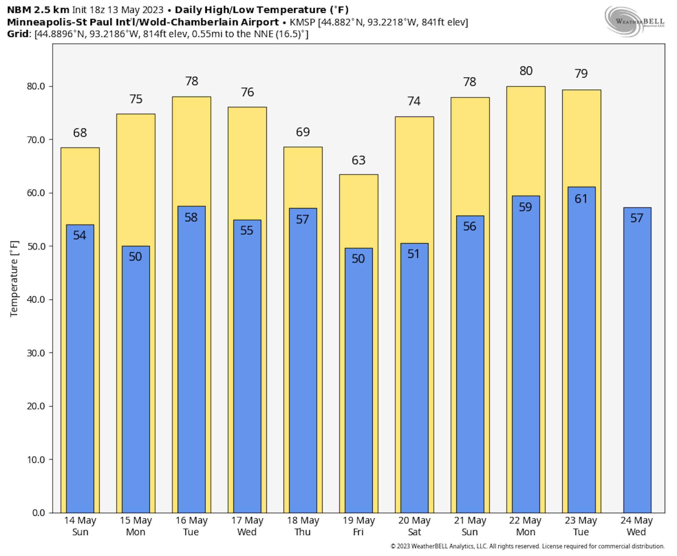 Temps on Sunday will be be nearly +5F to +10F above average across the northern half of the state with readings warming into the lower 70s. Meanwhile, lingering clouds and showers will hang on across far southern Minnesota through the first half of the day, where temperatures will be a little below average for mid May.