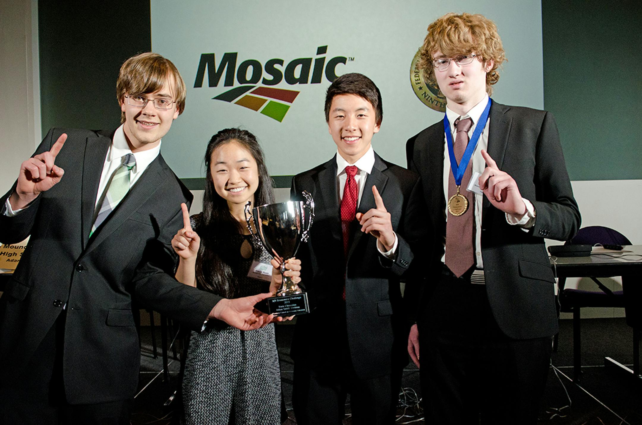 The winning students are Abraham Chen, Emily Ruan, Sam Rush, and Jacob Weightman. Their coach was Martha Rush, a social studies and economics teacher at Mounds View High School.