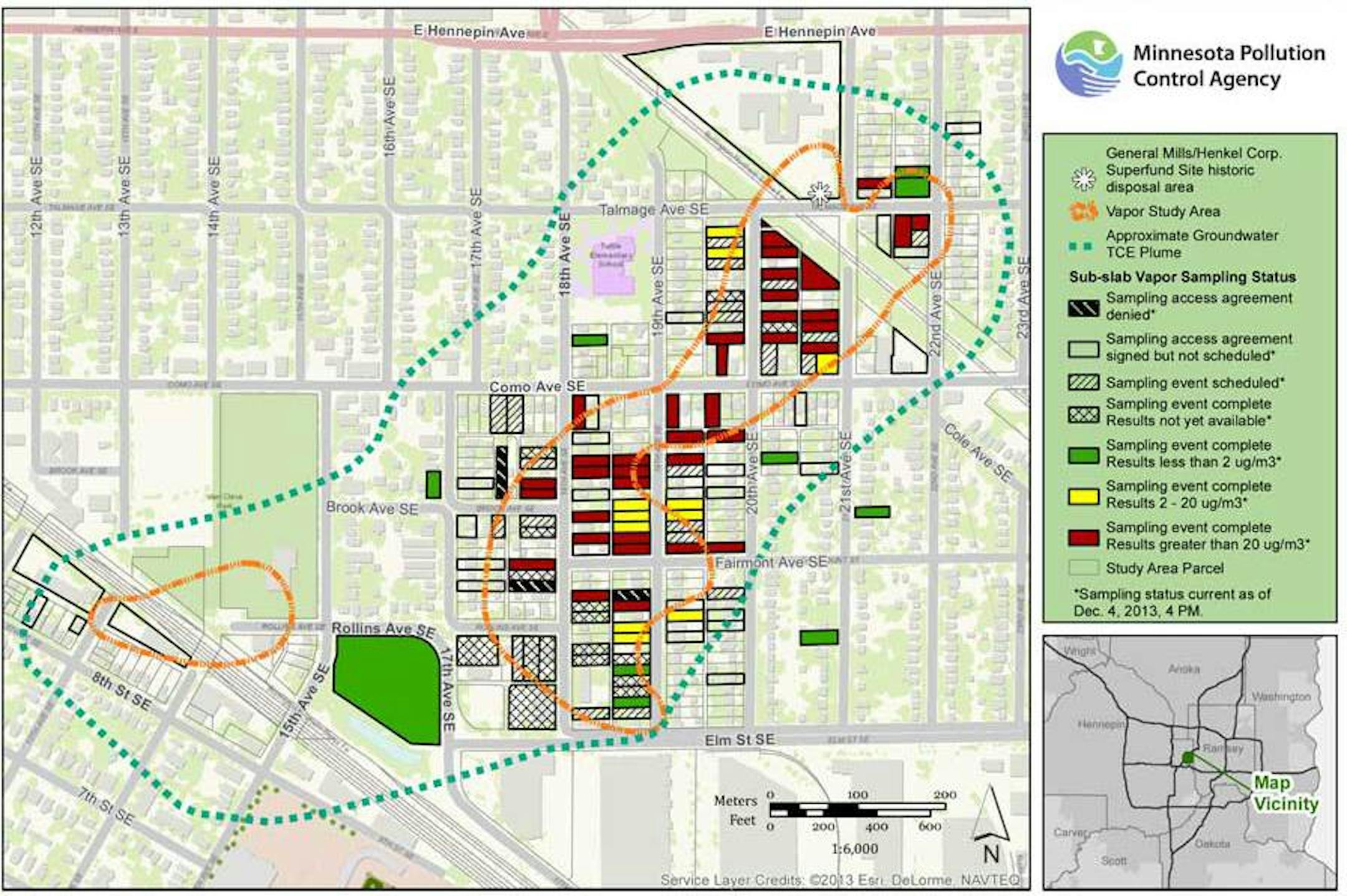 Updated results have been published as of Friday morning for 58 of roughly 200 homes in the target area, southwest of a former General Mills facility where solvents containing TCE (trichloroethylene) were dumped decades ago and filtered into soil and groundwater. Thirty-seven have turned up with higher-than-acceptable levels of the chemical.