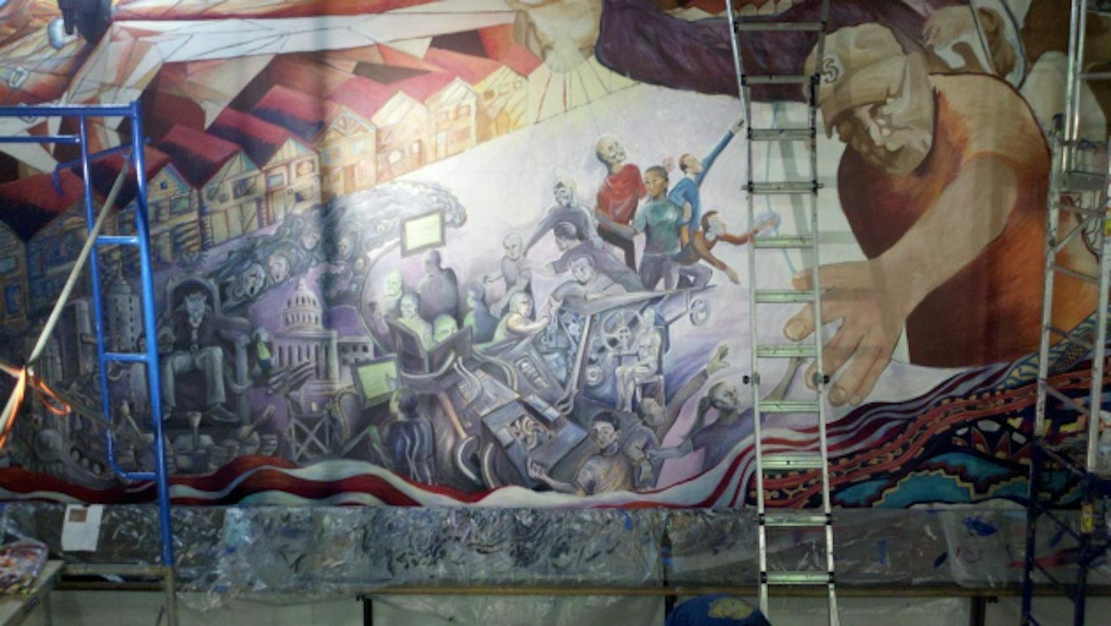 South High School's summer mural project is done and the school is hosting a community discussion of the design reflecting student interpretations of constitutional principles. The discussion will take place at an open house at the school, 3131 19th Av. S., on Sept. 5 from 6:30-9 p.m. Among those participating will be hip-hop artist Brother Ali and storyteller Rose McGee. Brother Ali is pictured in the mural. As reported in this blog last month, more than a dozen South students volunteered a good chunk of their summer to create the 1,700 square foot mural in a stairwell. They worked under muralists Greta McLain, a South alum, Shannon McEvoy, and Gustavo Lira, as well as South art teacher Denny Sponsler. MPLS stopped by during the last week of painting and we've posted a video here so you can get a glimpse. The theme, "we the people," draws on constitutional principles. That adult at the bottom of the scaffolding is Sponsler, and his face also appears in the figure of the pitcher, at his students' insistence.