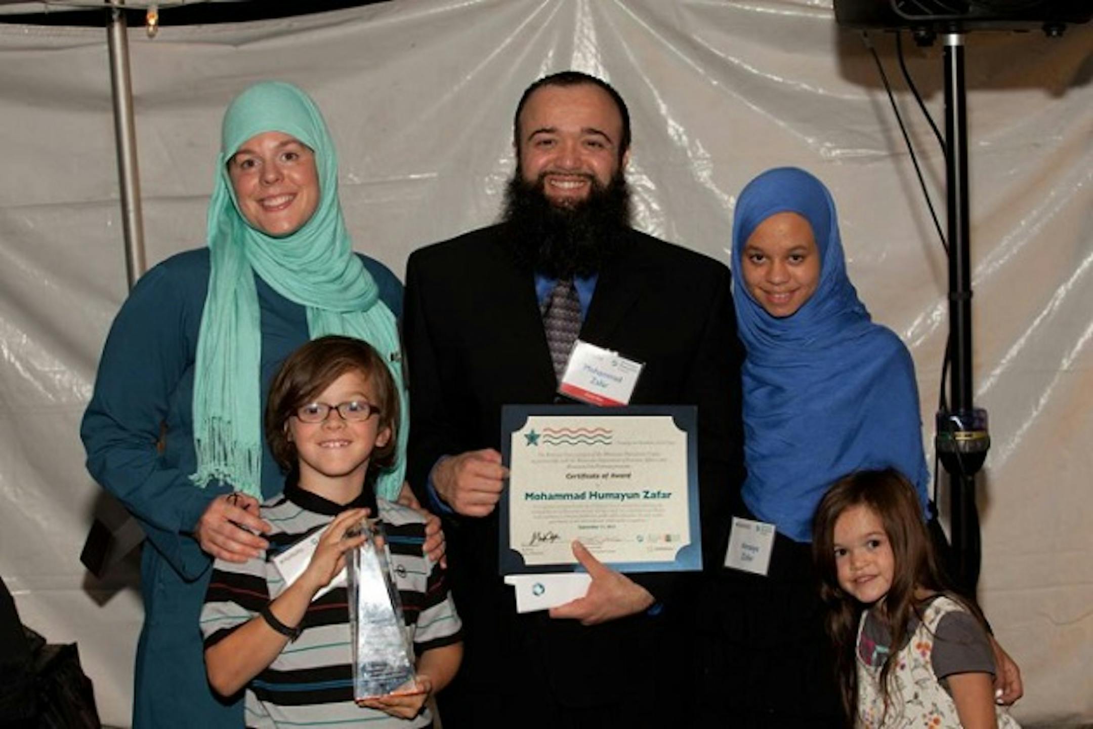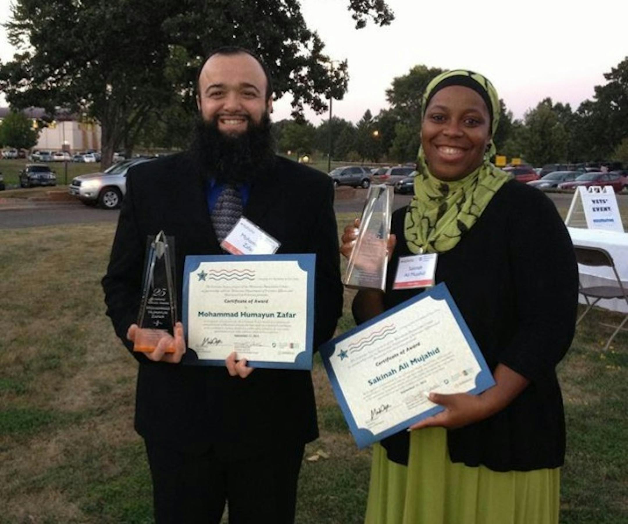 Two Minnesota Muslims, Sakinah Mujahid and Mohammad Zafar, were among those who were honored at the 25 Veterans' Voices Awards ceremony at the Minnesota Humanities Center on 9/11/2013. The 25 Veterans' Voices Award highlights veterans who have made "exceptional contributions to the community, in business, health care, public safety, education, the arts, government or any other endeavor which merits recognition." It features young veterans who "have not merely returned to civilian life but are thriving and giving back to their Minnesota communities."