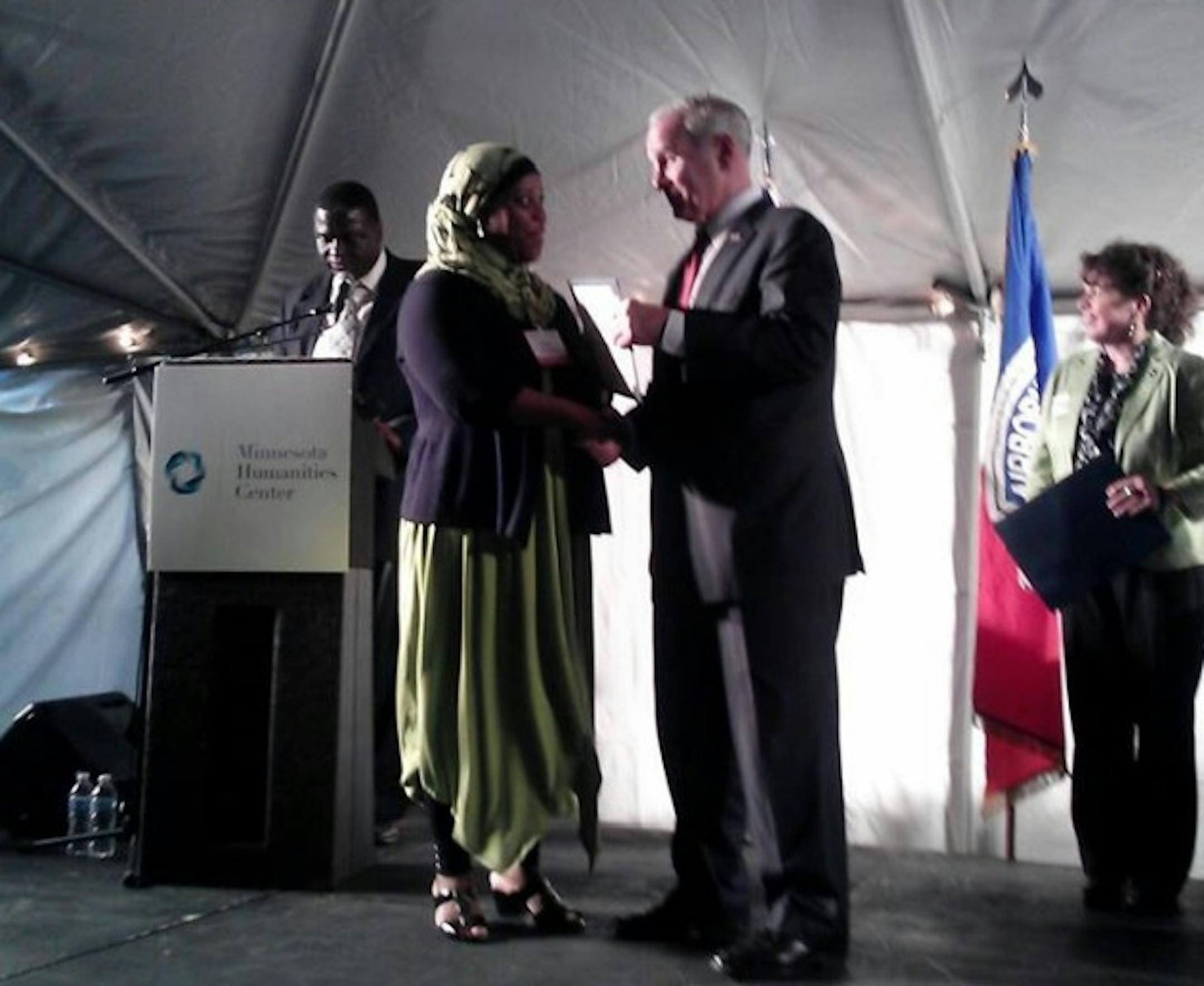 Sakinah Mujahid receiving the award from Governor Mark Dayton