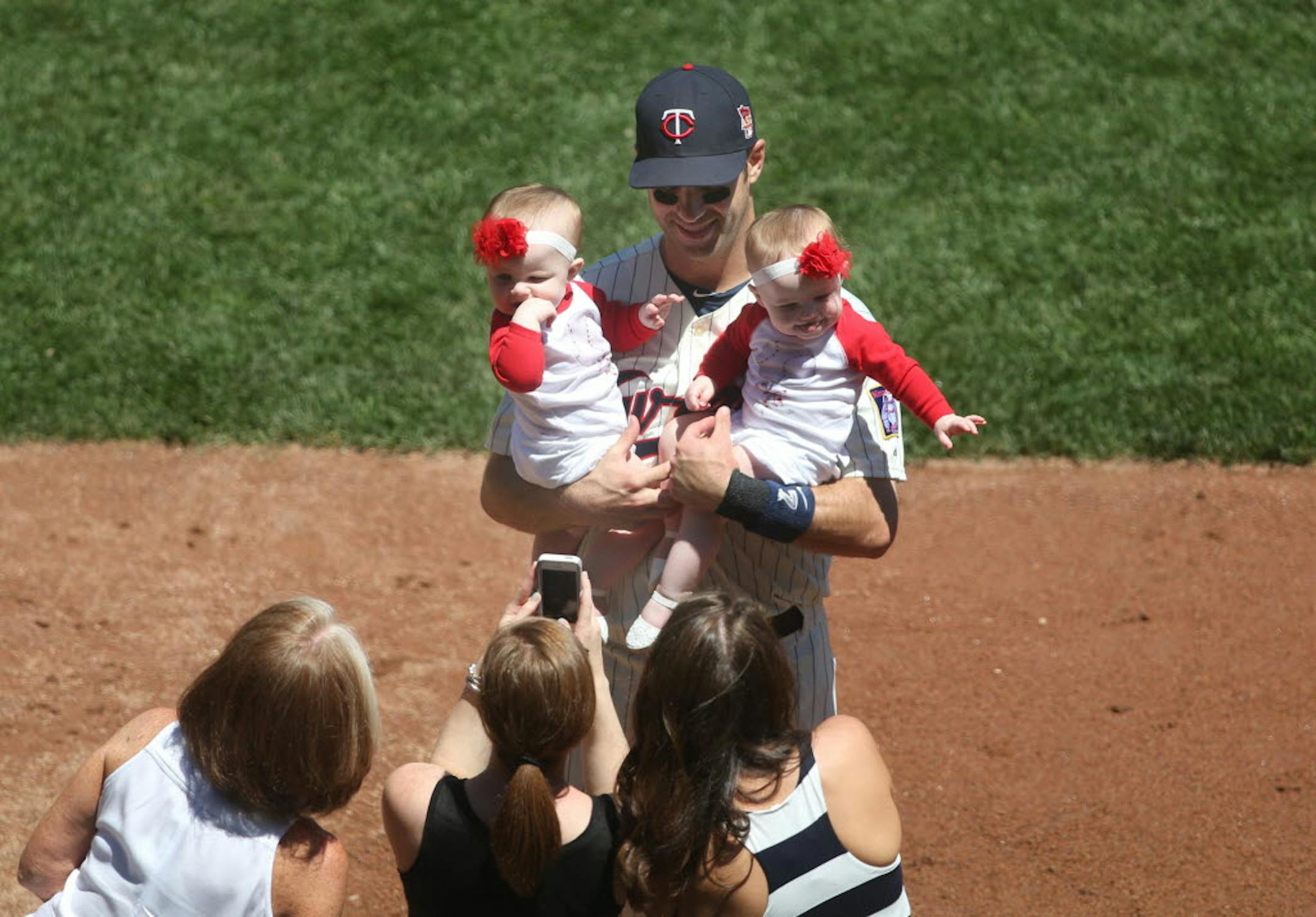 But the real show-stealer was Joe Mauer and his twin daughters, Emily and Maren (pictured above when the girls were much smaller). They had a "Beauty and the Beast" theme for their Halloween, and well, the internet pretty much swooned over their picture. Here it is in case you missed it: