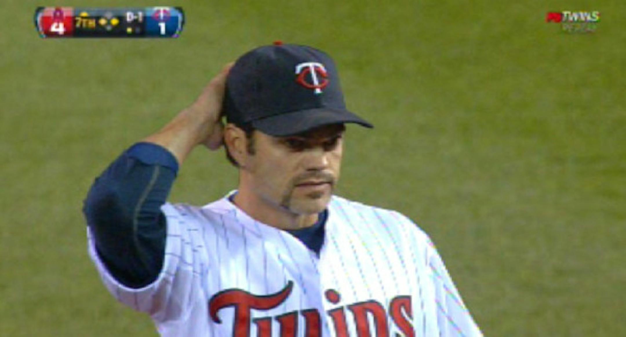 We must take small victories in the midst of a 7-21 season. As such, we present some pretty awesome facial hair sported in last night's loss to the Angels by both Ryan Doumit and Jamey Carroll. The burning question: Which Twins starter has the BEST lip fruit? Let's go to the images. (Screen grabs thanks to @TCAnelle). As always, find your replay needs on MLB.com and your live Twins needs via FS North).