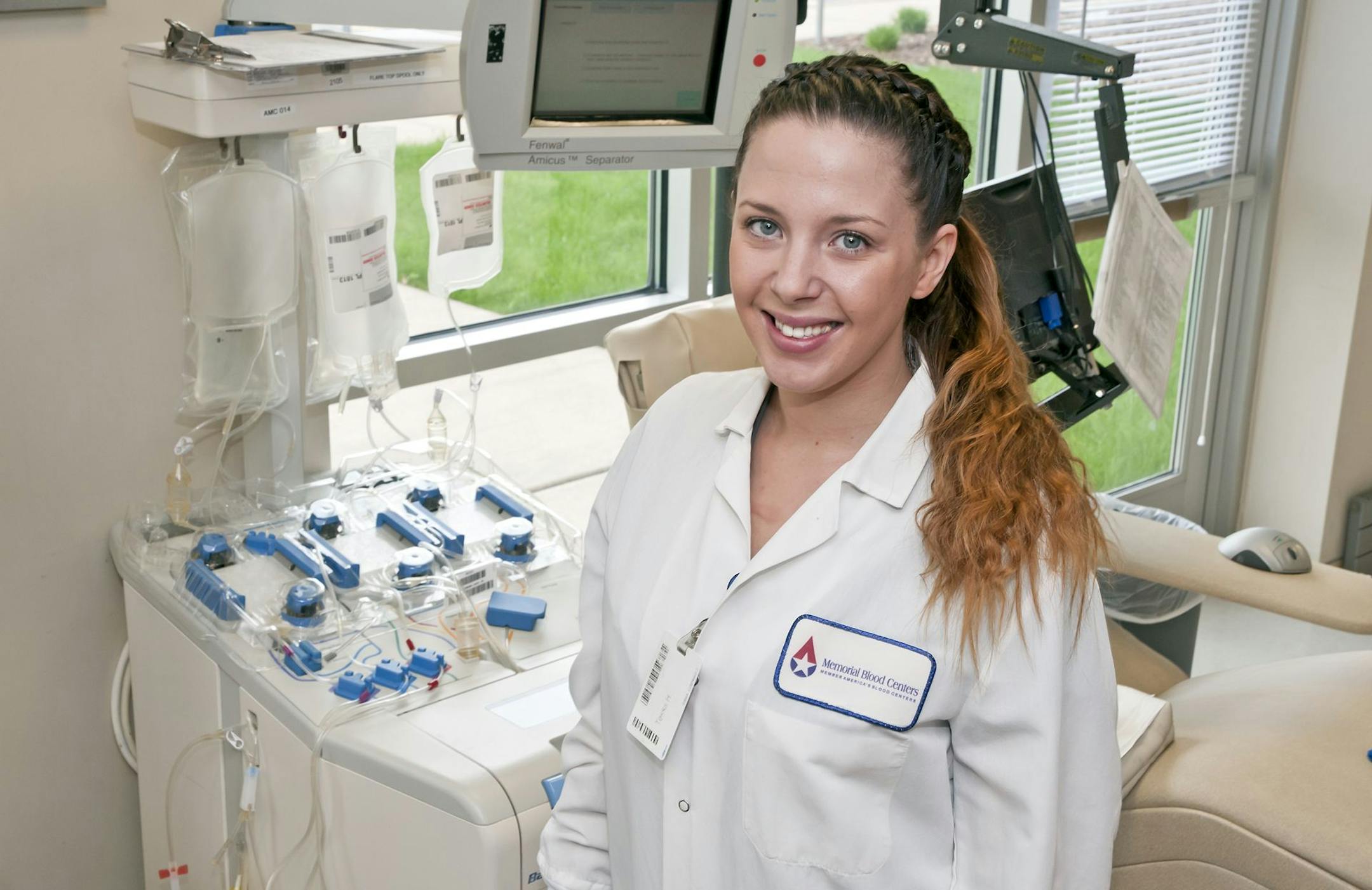 House was introduced to phlebotomy at Everest College, where it was part of her training as a medical assistant. After graduation she worked in group homes for a while, but moved into phlebotomy full-time because it was less physically demanding. She started at a plasma center. Then, she said, a friend got a job at Memorial Blood Centers. "She loved the company, so I came here." Of her current position House said, "You just get to hang out with people all day."