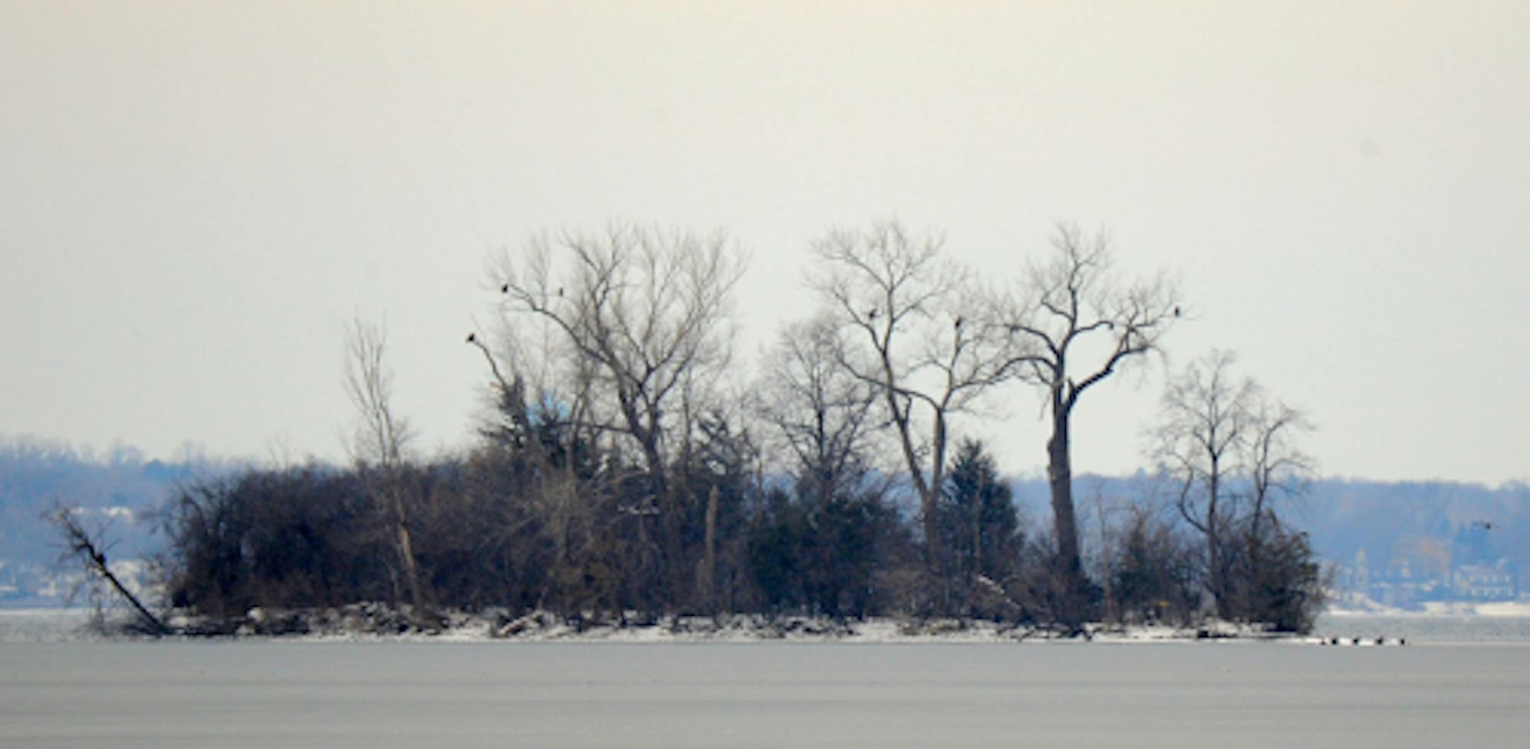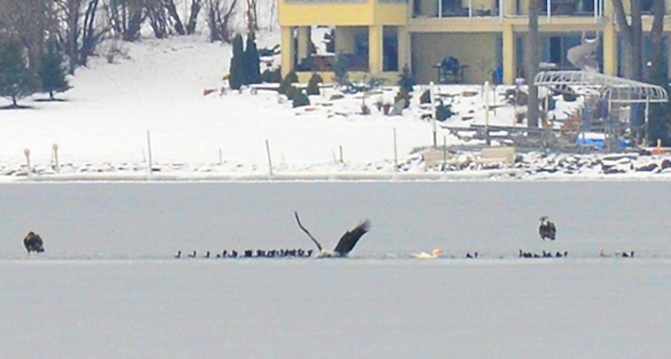 There is a small island on the west side of the entry to Wayzata Bay. Eagles have been roostin there. In this photo you can see several in the trees, four on the ice at the righthand end of the island, and one eagle in the air at that edge of the photo. The total number of eagles visible from the Wayzata city beach at peak times was at least 32.