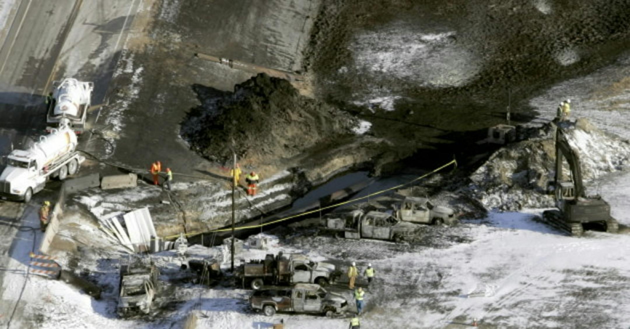 From a 2007 event: Enbridge workers vacuum up crude oil Thursday near Clearbrook, Minn. at the site where a pipeline caught fire a day earlier killing two Enbridge employees.
