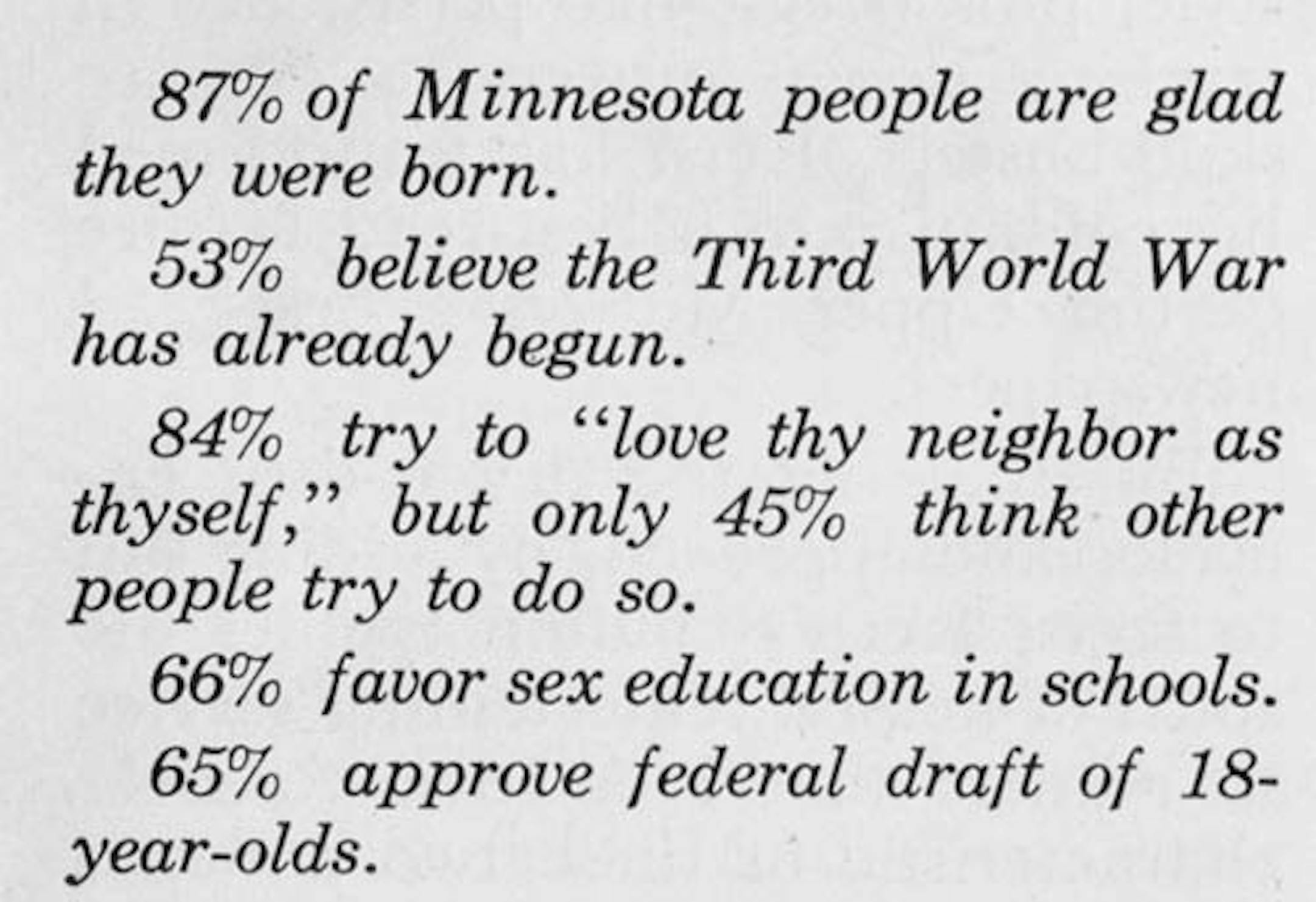That's from an ad the Star-Tribune's "What Makes a Newspaper Great?" series, which ran nationally for four years. One of the things that made us Great was the Minnesota Poll, which found all sorts of interesting facts: