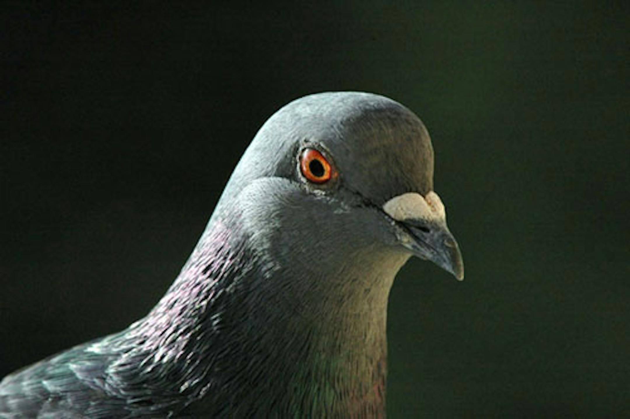 A Rock Pigeon, below, our garden-variety pigeon, a beautiful iridescent bird that is not trash in any way. Watch a flock of pigeons wheel through the air. Consider the wonderfully odd way they walk, head bobbing with each step. Why, and how do their eyes adjust to the constant focal change? Or, enjoy their company by tossing them bread crumbs or popcorn on your next visit to a city park. Few bird species are as accepting of us.