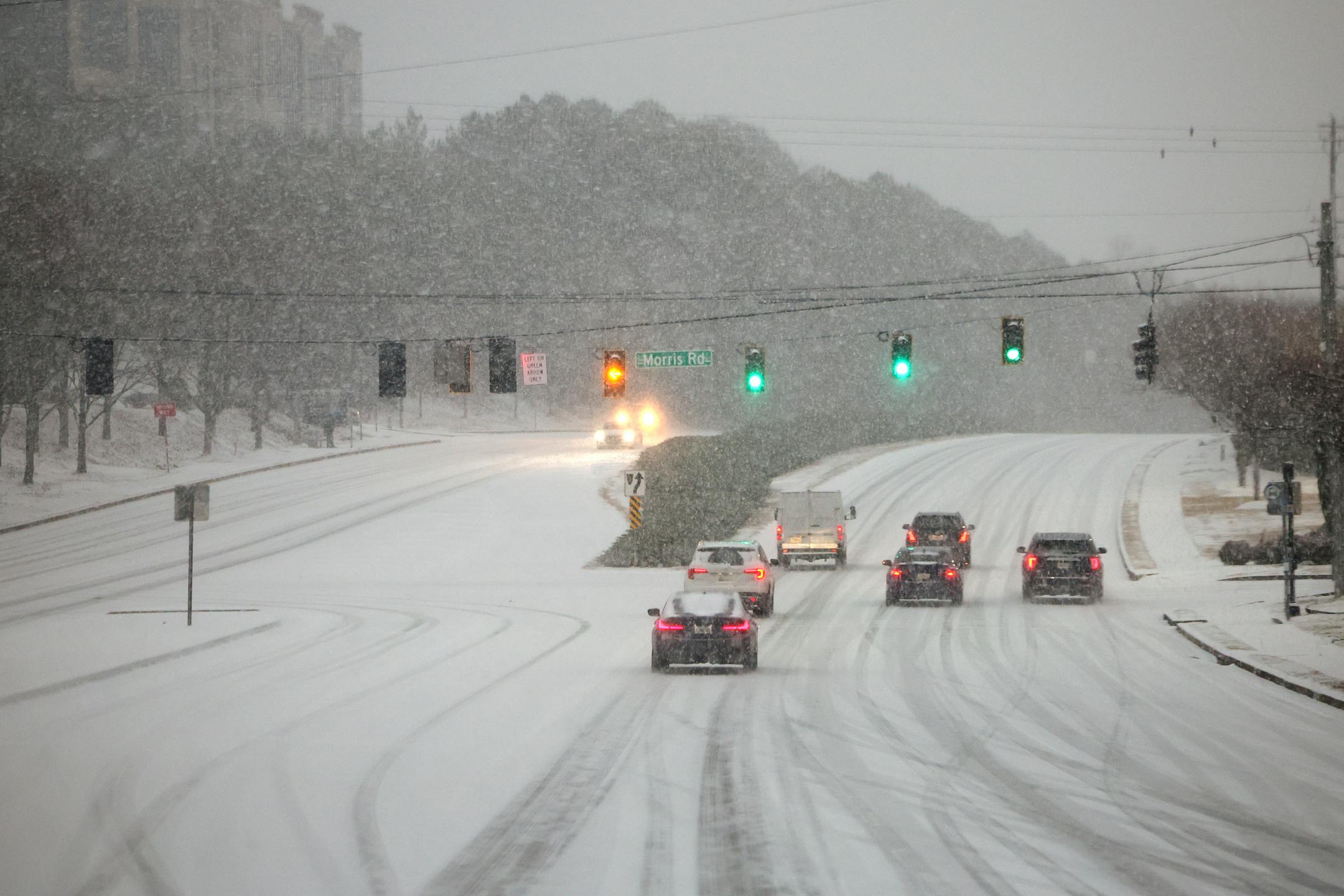 A winter storm dumped snow and ice on the Atlanta area Friday and roads were expected to refreeze Saturday night.