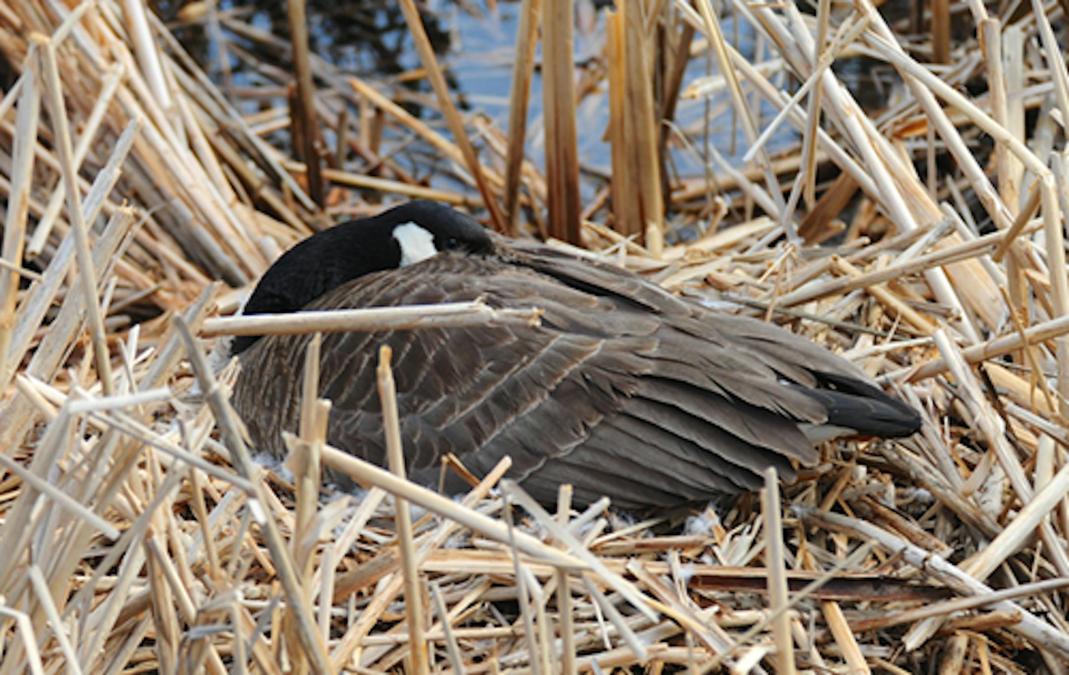 The nests of geese are exposed, demanding constant care from the bird. This Canada Goose will get off her eggs only to turn them.